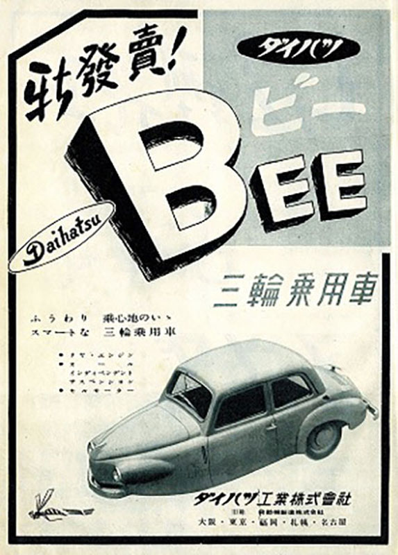 Premier automobile de Daihatsu, la Bee, apparaît en 1951. Le moteur bicylindre à plat 4 temps OHV de 540 cm3 à refroidissement à air procure 13,5 ch pour ce petit véhicule à trois roues de 800 kg.