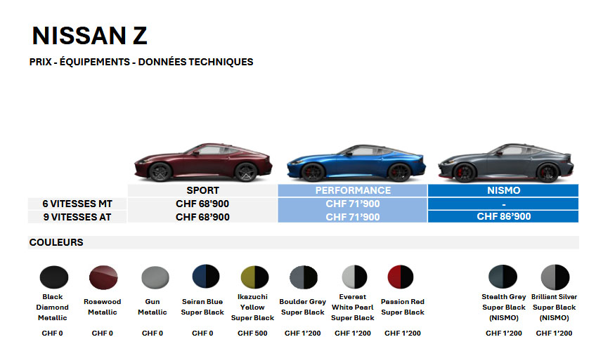 La Z est officiellement annoncée en Suisse en décembre 2024. Elle est disponible dès 2025 en trois variantes : Sport, Performance et Nismo.