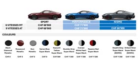 Chez Nissan USA, trois versions de base, Sport, Performance et Proto Spec. Sur le site japonais de Nissan, quatre versions sont proposées, Z (base), Z-S (boîte manuelle 6 vitesses), Z-T (boîte automatique 9 vitesses) et Z-ST (version supérieure). Je n'ai pas bien compris la différence entre la Z et la Z version S. 9 coloris sont à choix, dont 6 bi-tons.