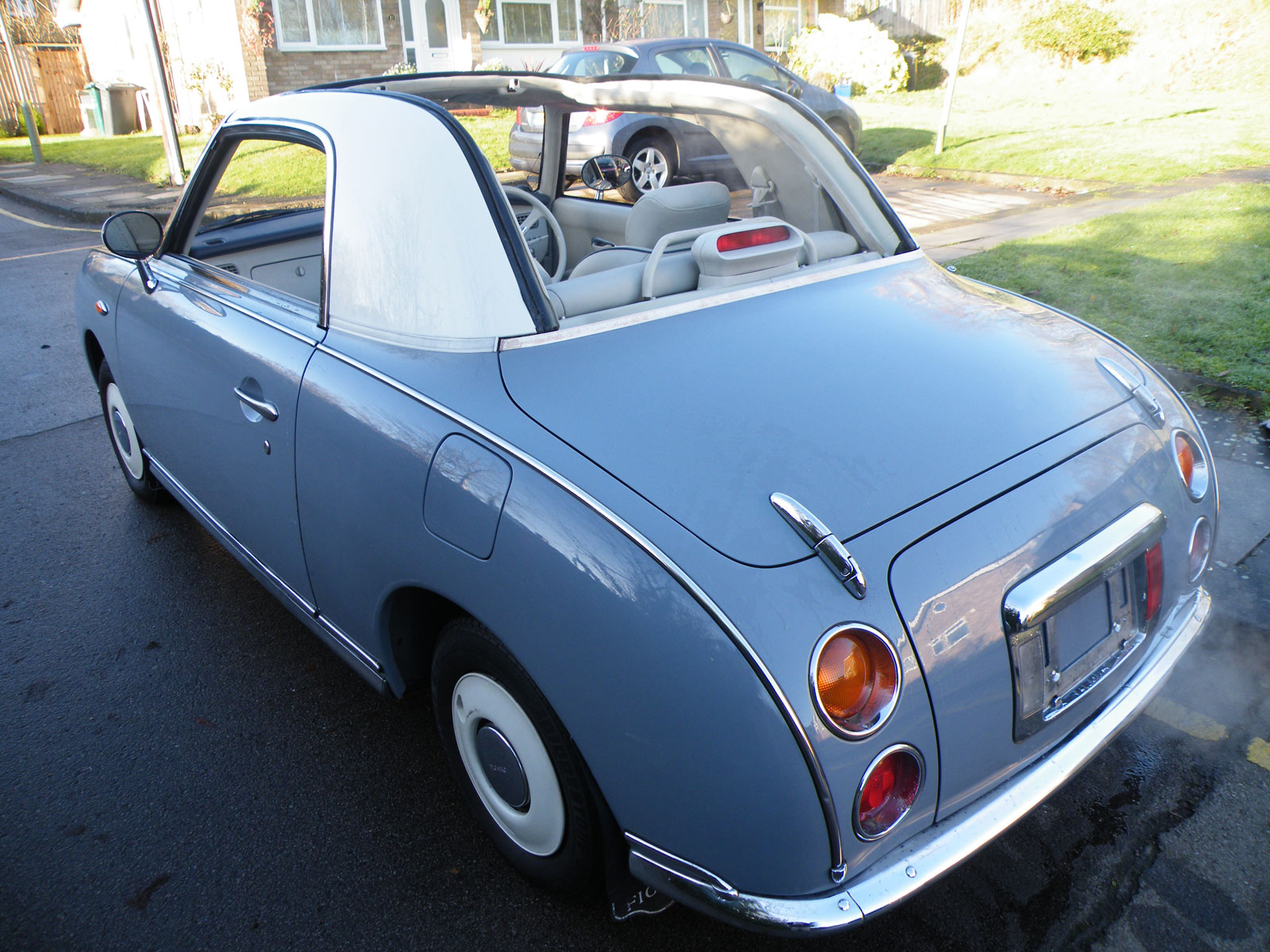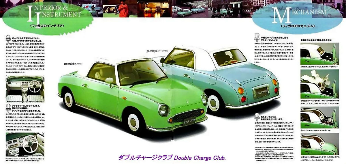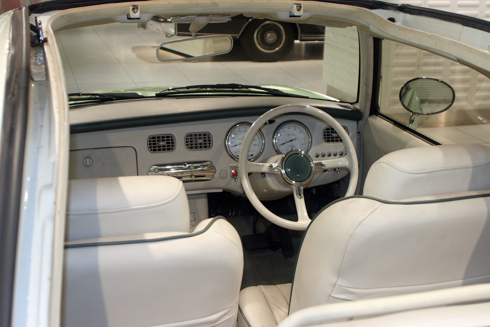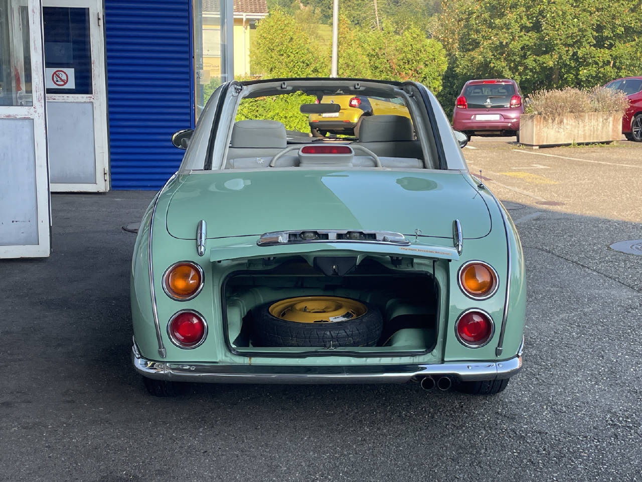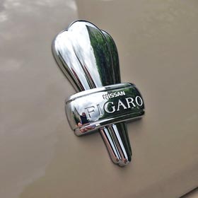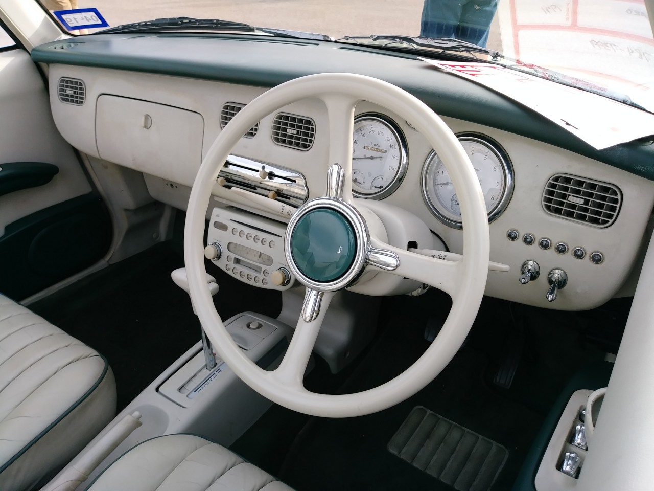 Cette adorable petite machine de 374 cm de long reprend la base et le moteur de la Micra. Le bouclier et les ailes avant sont en fibre de verre. Du au fait que le toit en toile couvre toute la partie supérieure de l’auto, le châssis a dû être renforcé et la voiture est plus lourde qu’une Micra standard, 810 kg contre 770 kg. Afin de palier au manque de puissance, un turbocompresseur est monté sur le moteur 4 cylindres en ligne OHC de 1 L (MA10ET) qui gagne en puissance, 76 ch et 106 Nm. La transmission est confiée à une boîte automatique à 3 vitesses. La vitesse maximum est de 170 km/h, en théorie, avec vent dans le dos. La Figaro n’a rien d’une voiture de sport, au niveau du châssis, des suspensions, des freins et de la mécanique, ce sont les organes de la Micra. Elle reste donc un citadine mais avec une émanation particulièrement douce et ludique que l’on ne trouve pas dans une autre automobile.