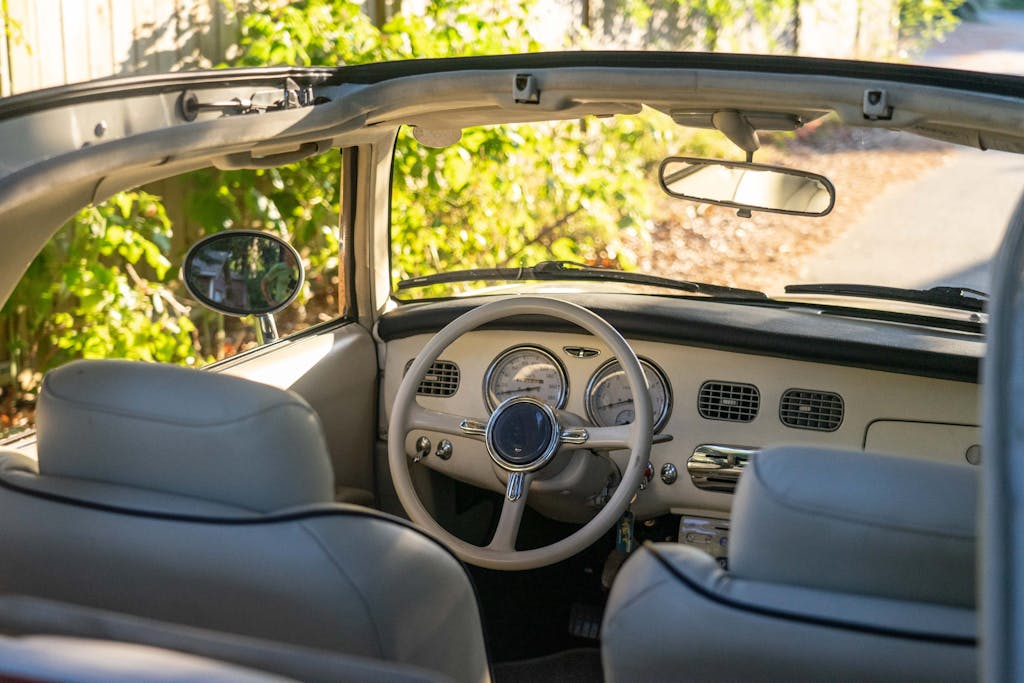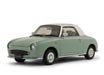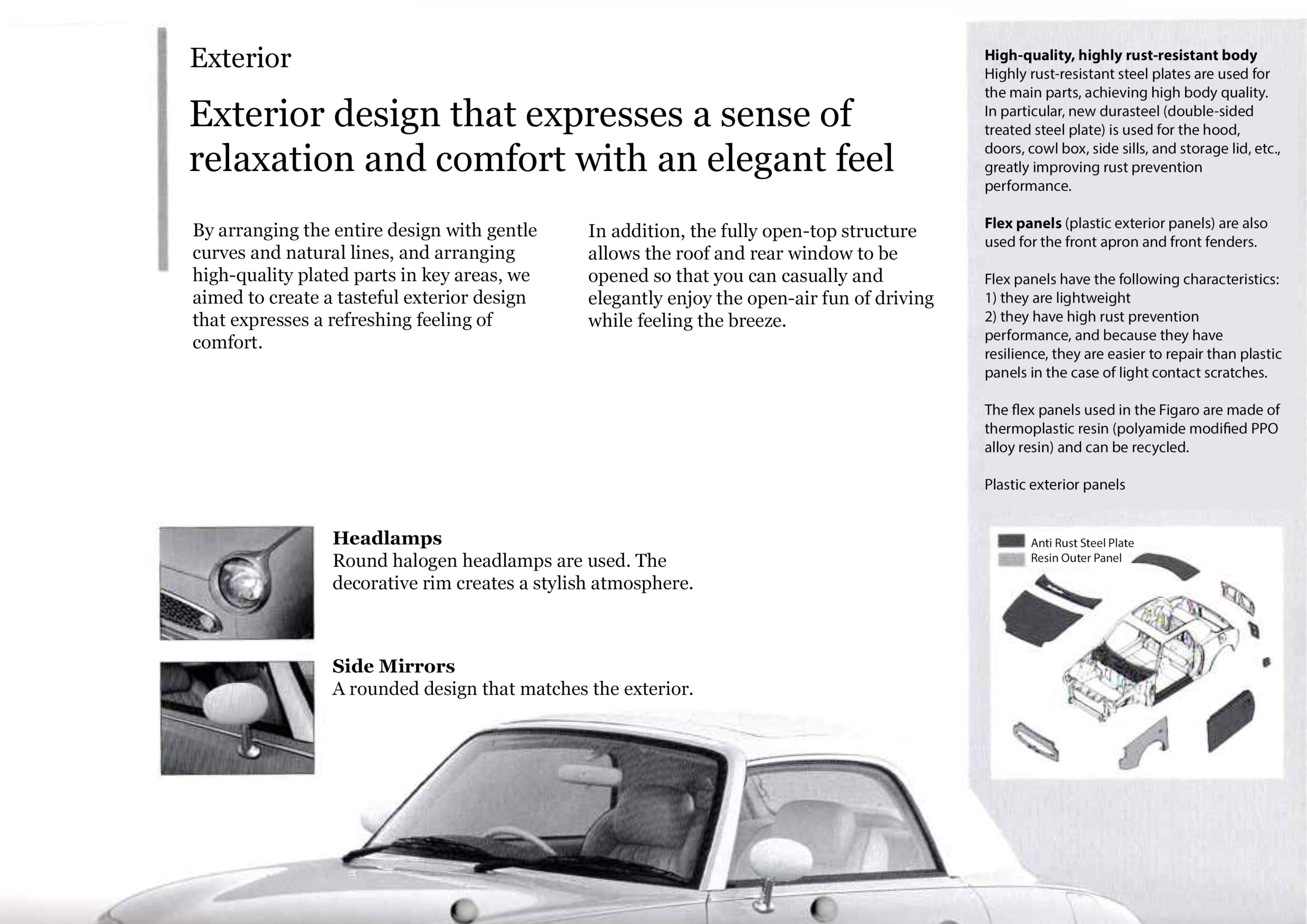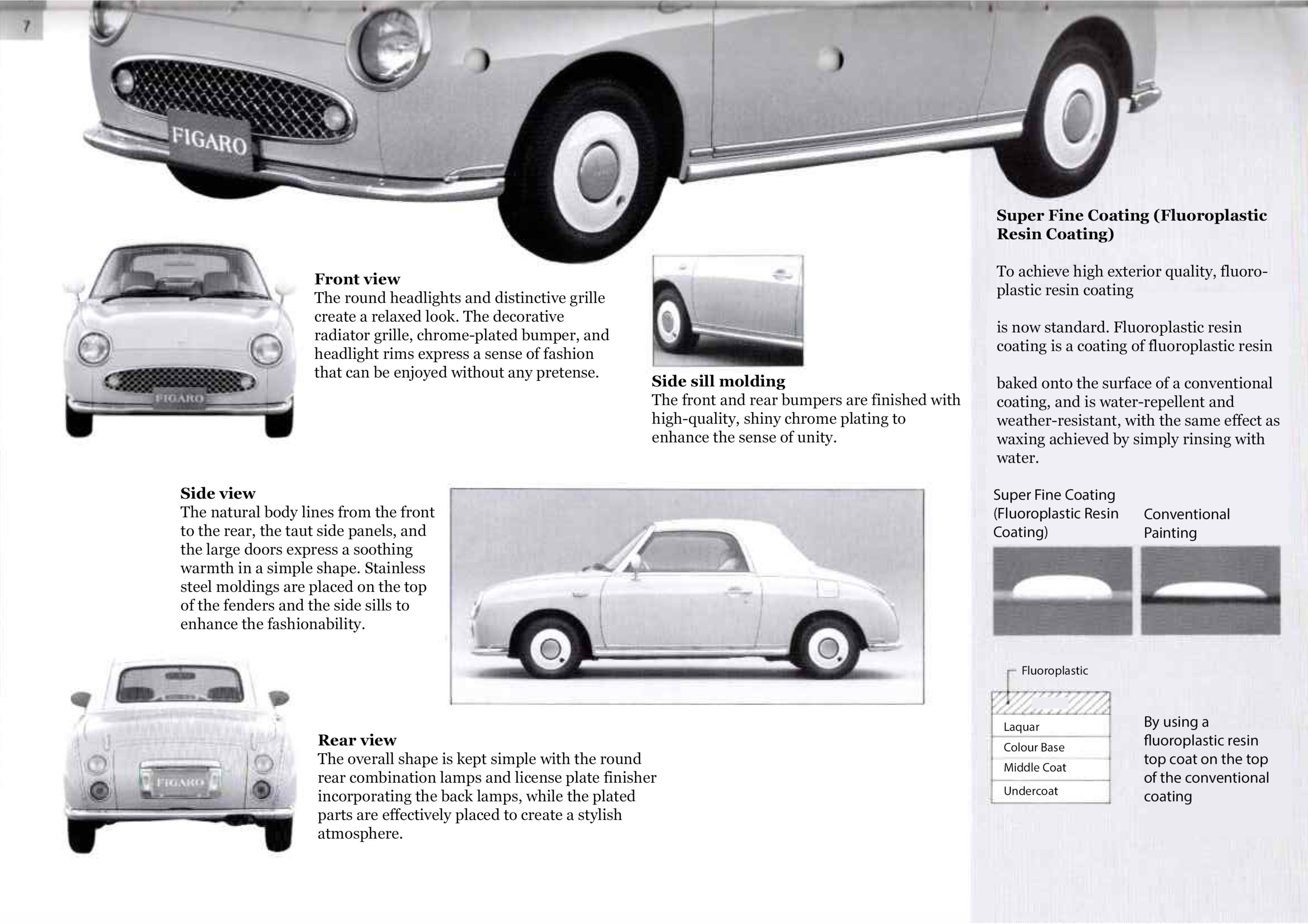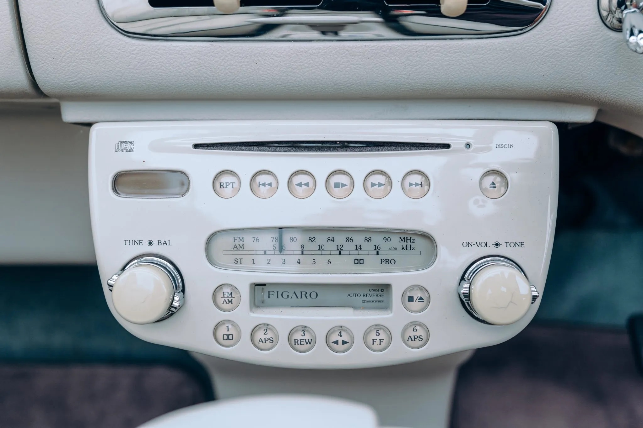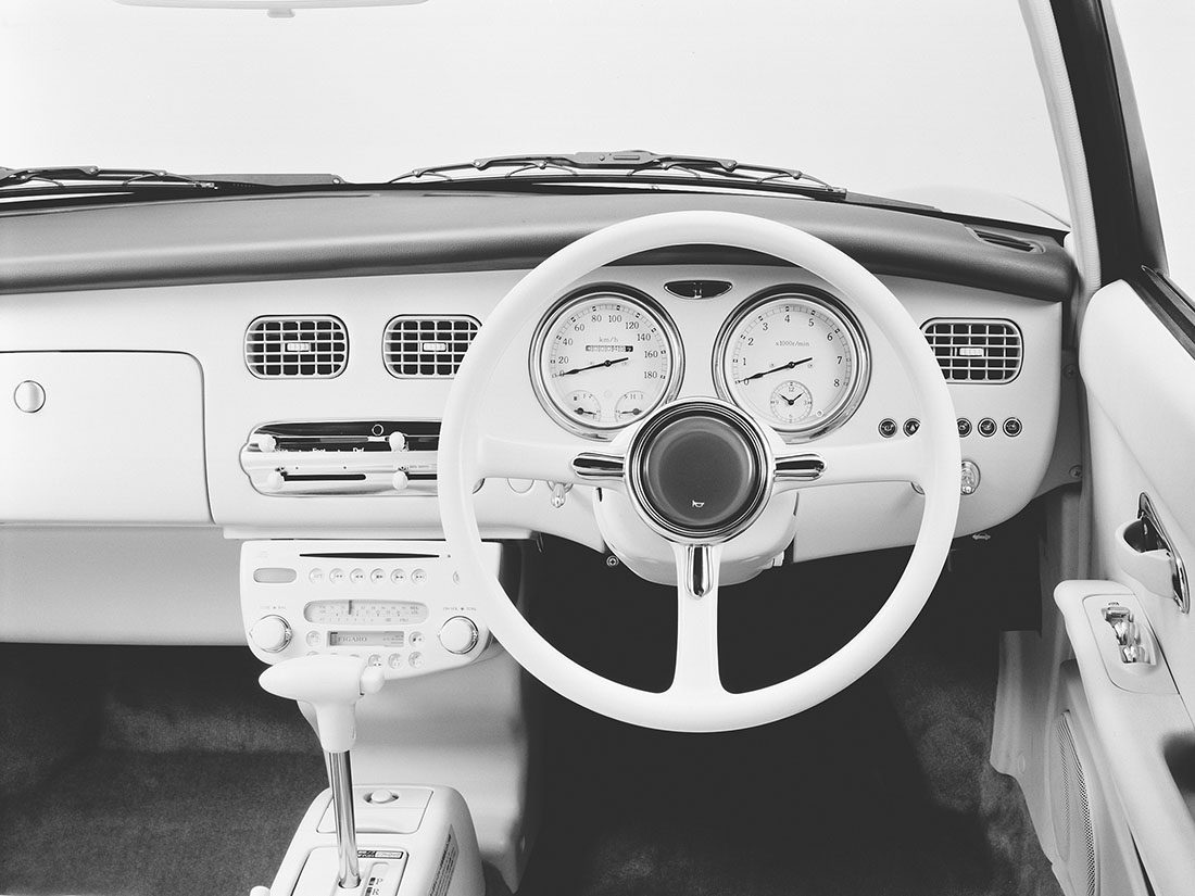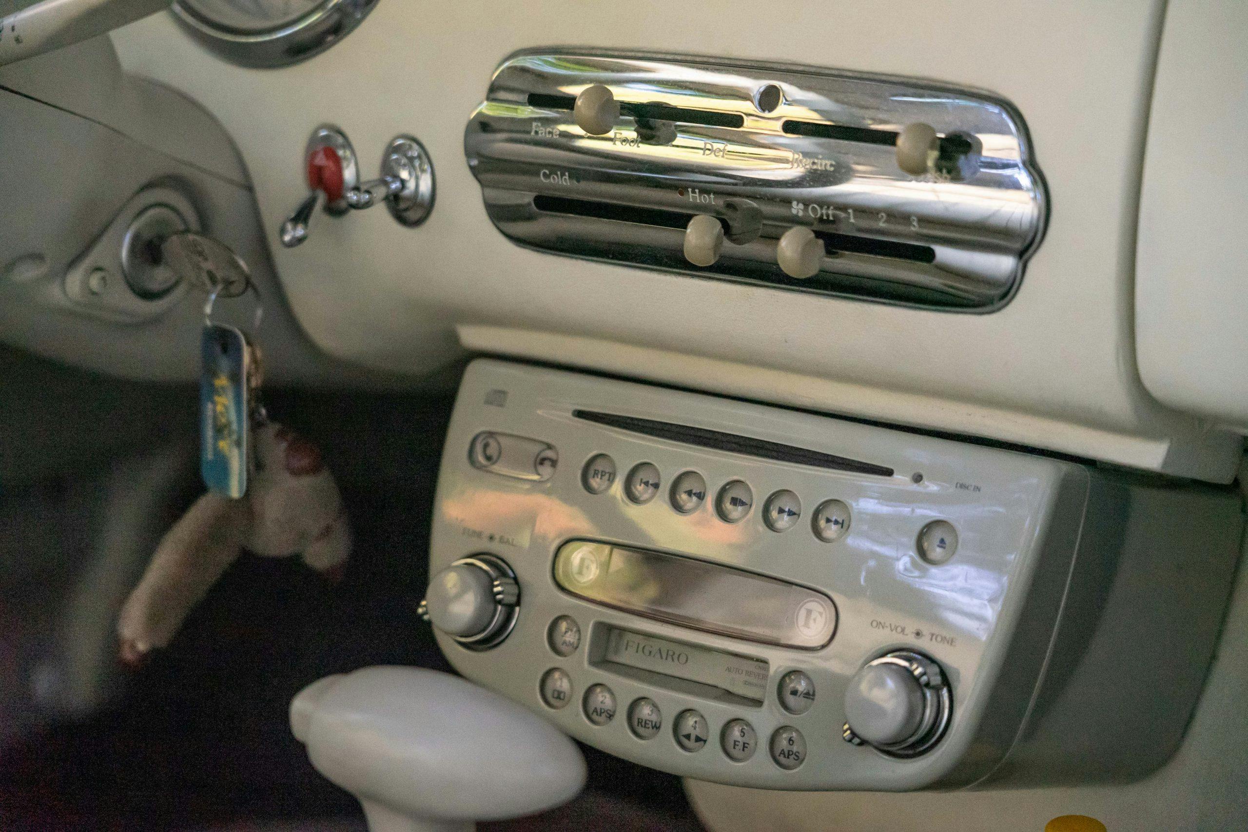 Cette adorable petite machine de 374 cm de long reprend la base et le moteur de la Micra. Le bouclier et les ailes avant sont en fibre de verre. Du au fait que le toit en toile couvre toute la partie supérieure de l’auto, le châssis a dû être renforcé et la voiture est plus lourde qu’une Micra standard, 810 kg contre 770 kg. Afin de palier au manque de puissance, un turbocompresseur est monté sur le moteur 4 cylindres en ligne OHC de 1 L (MA10ET) qui gagne en puissance, 76 ch et 106 Nm. La transmission est confiée à une boîte automatique à 3 vitesses. La vitesse maximum est de 170 km/h, en théorie, avec vent dans le dos. La Figaro n’a rien d’une voiture de sport, au niveau du châssis, des suspensions, des freins et de la mécanique, ce sont les organes de la Micra. Elle reste donc un citadine mais avec une émanation particulièrement douce et ludique que l’on ne trouve pas dans une autre automobile.