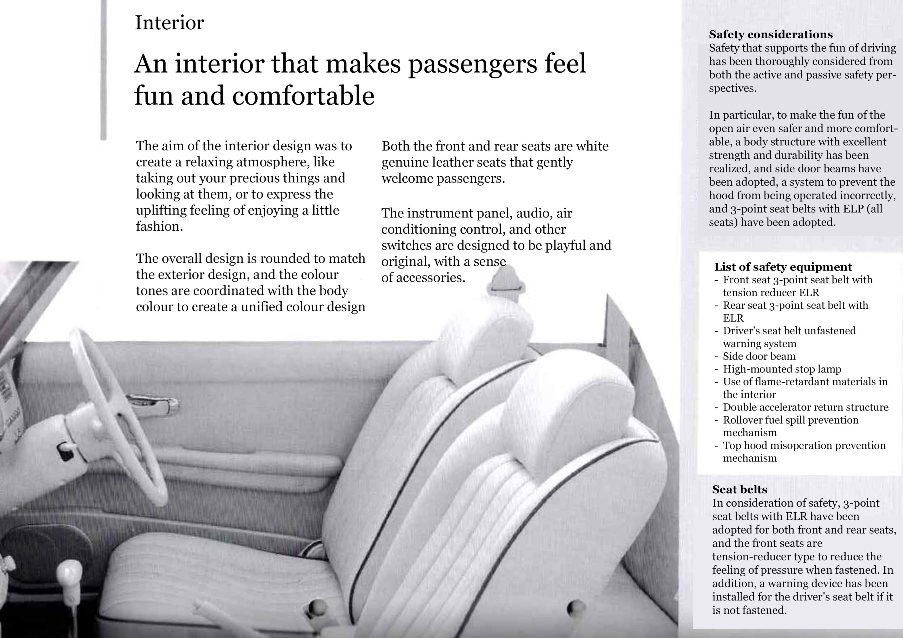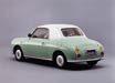 La jolie carrosserie aux courbes féminines simples et fluides doit son design à Naoki Sakai et Shoji Takahashi, ce dernier ayant été récompensé pour cette réalisation. Ici on ne s'inspire plus seulement des premières citadines japonaises, mais une influence avec la production européenne transparaît. Le design intègre des repères clé rappelant intuitivement les voitures des années 60. Les phares ronds avec la calandre ovale qui lui donnent une bouille sympathique, les chapeaux de roues pleins sur des jantes de 12'', les rétroviseurs ronds montés sur des pieds chromés, les rappels de clignotants en forme de larme, le support de plaque arrière chromé, la peinture bi-tons, les poignées de porte…