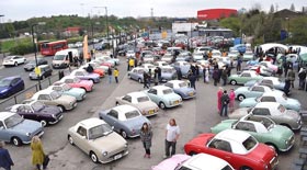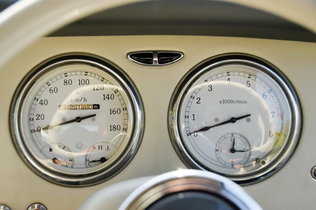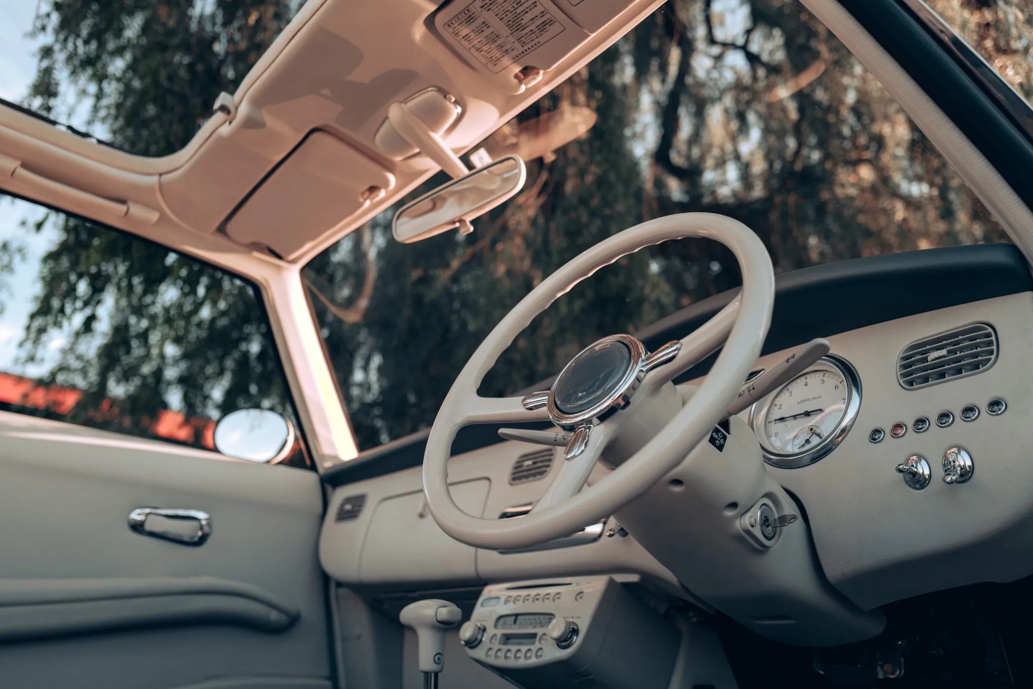 A l’intérieur, on est bien loin des ambiances sombres et insipides des voitures modernes. Dans la Figaro, c’est le soleil de Toscane, tout fleure bon avec les souvenirs vintages et la dolce vita. Le tableau de bord lisse et simple comprend deux magnifiques compteurs circulaires, des grilles d’aération coupe-frites, les commandes de la climatisation entourées d’une plaque chromée, quatre interrupteurs basculants également chromés et ce volant fin qui semble fait de bakélite blanche avec le bouton du klaxon au centre de la même teinte que la carrosserie. Même l’autoradio avec lecteur de cassette et CD a un look surgissant du passé. Le levier de vitesse de la boîte semble avoir été réalisé par Hurst pour l’USS Enterprise de Star Treck. Ce n'est pas une vraie 4 places, l'espace réservé à la banquette arrière est très limité.