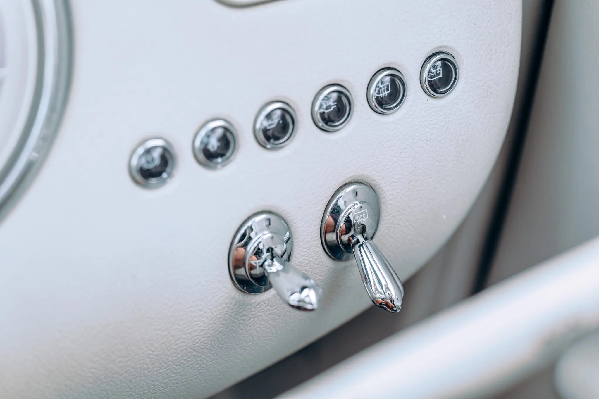 Son insigne est formé d’une fleur de lys à trois pétales. Ce symbole se retrouve un peu partout dans et autour de la voiture. Volant, switches, poignées… quelqu’un en a compté 21 au total.