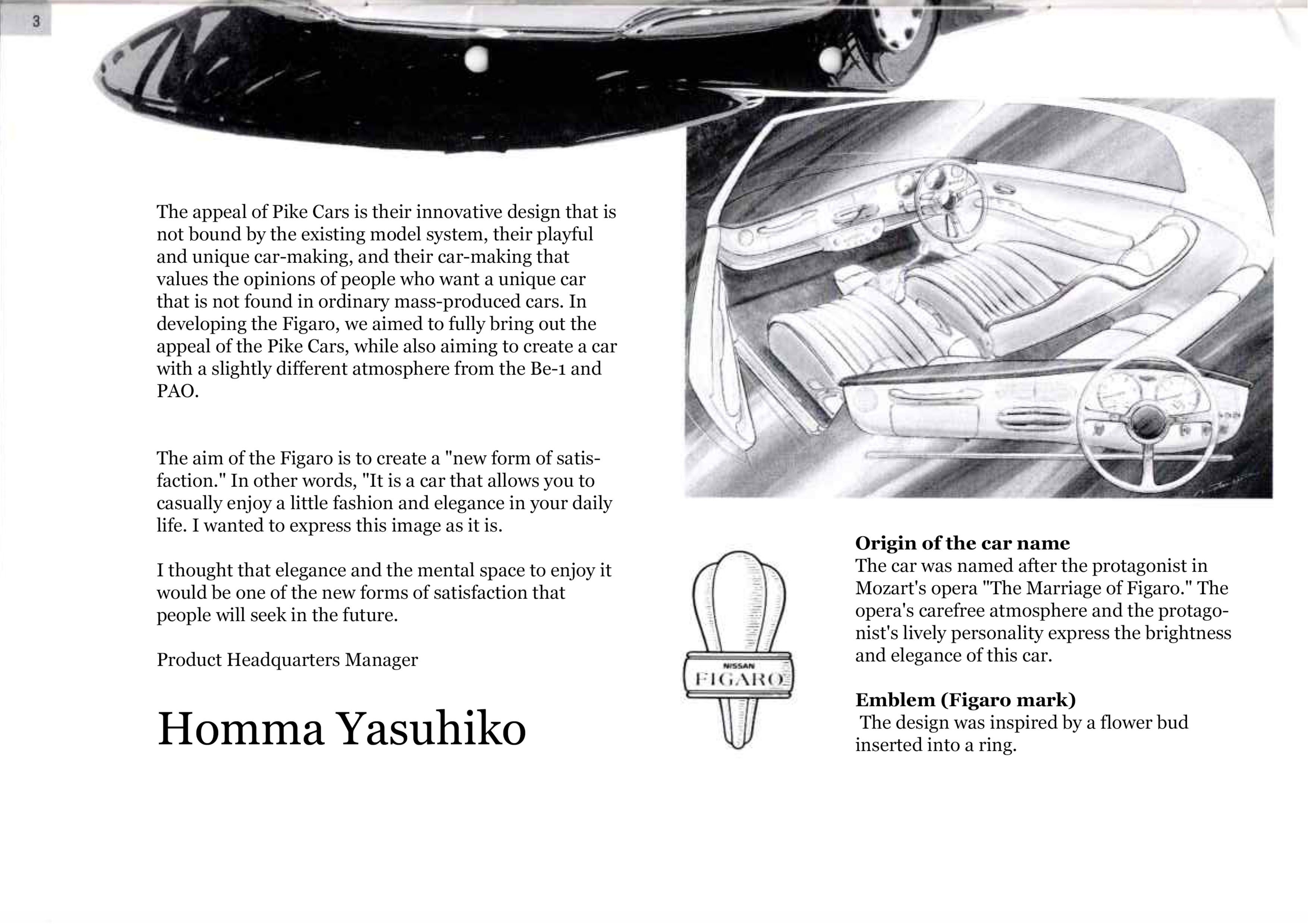 PIKE Factory a débuté avec La Be‑1, puis la Pao. La troisième réalisation de l'atelier est la Figaro. Elle est présentée en 1989 au salon de l’automobile de Tokyo dont le thème, cette année, est « Retour vers le Future ».
