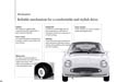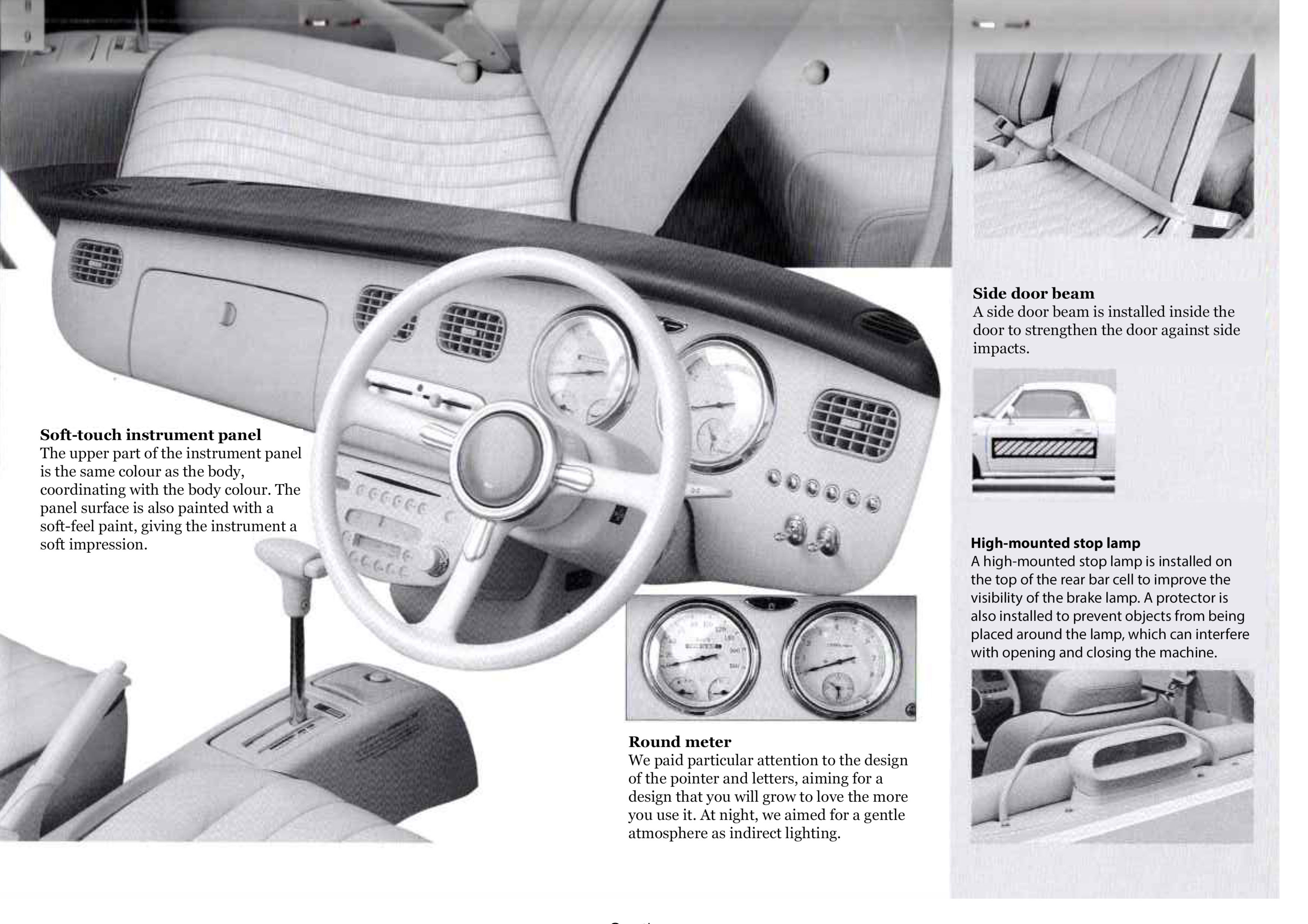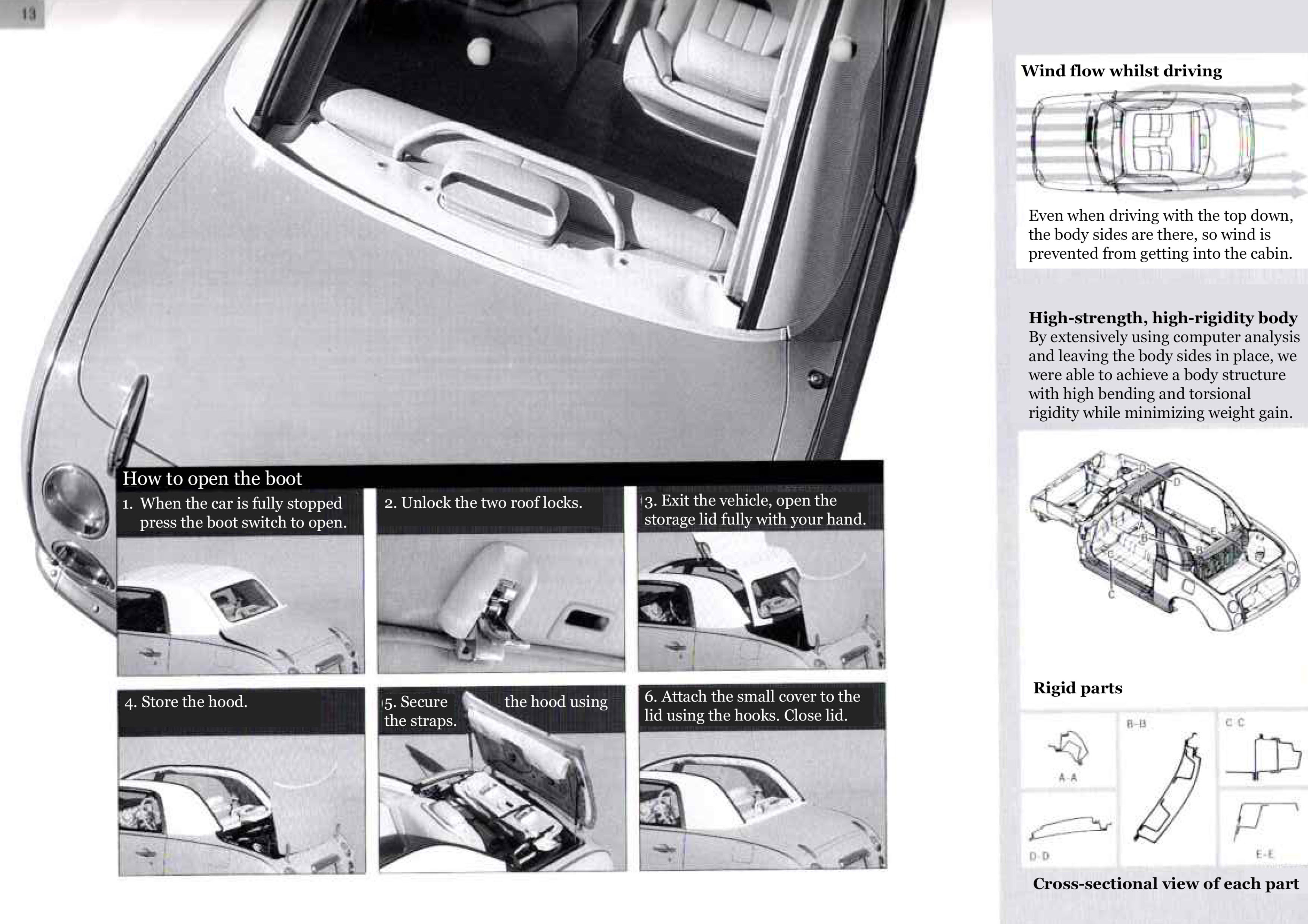 Elle a l’air d’un cabriolet mais en fait les côtés latéraux sont rigides. Le couvert est une toile souple, à la manière de la 2CV, de la Fiat 500 ou de la Vespa 400, qui s’escamote électriquement en accordéon dans la partie arrière de la carrosserie qui ressemble au coffre. Le vrai coffre est un petit espace accessible par une trappe située plus bas, entre les phares arrière et supportant la plaque d’immatriculation. Plus on la regarde et l’on découvre des détails de finition, plus on a envie d’en posséder une.