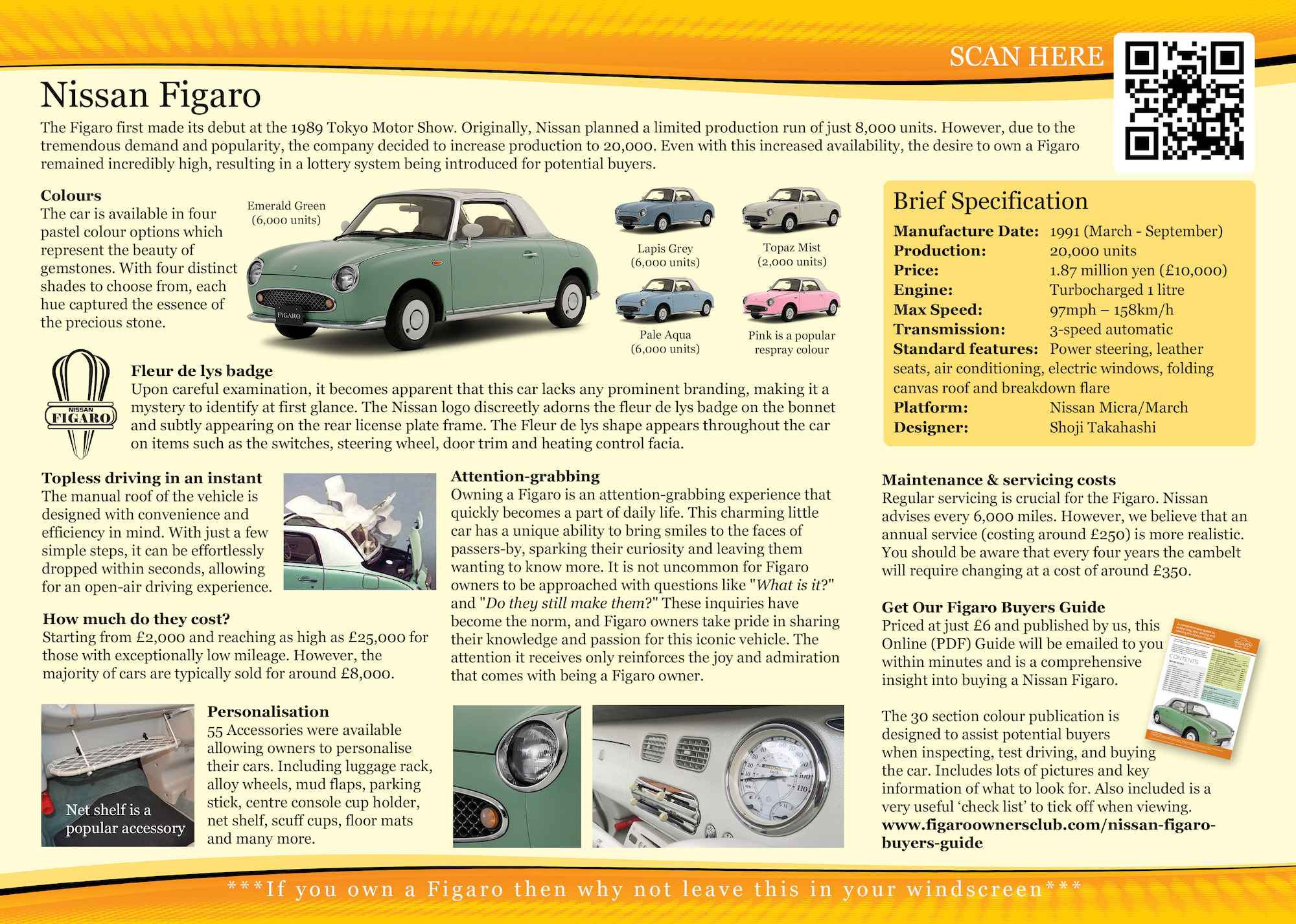 Plusieurs paramètres font que la Nissan Figaro est une voiture prisée par les collectionneurs. En plus de tous les détails de finition faisant référence à l’aspect néo-rétro du design énumérés plus haut, et qui font tout son charme, le fait qu’elle ait été distribuée au compte-goutte par tirage au sort a immédiatement placé l’auto dans un contexte de forte désirabilité. Son attirance est donc également liée au fait qu’elle ne pouvait pas être achetée chez un concessionnaire comme une autre voiture. Il faut reconnaître aussi que son allure de jouet dégage une un côté positif qui fait tourner les têtes et donne le sourire à ceux qui la voient passer comme à ses occupants. Réservé au marché japonais, les Anglais en ont importés des centaines d’exemplaires, au point qu’un club s’est formé outre-manche, le « Figaro Owners Club », qui est actif dans l’organisation d’événements et la maintenance des voitures. Son slogan est « retro, rare et reliable ». Malgré son volant à droite, elle peut être homologuée dans d’autres pays sur la base technique de la Micra.