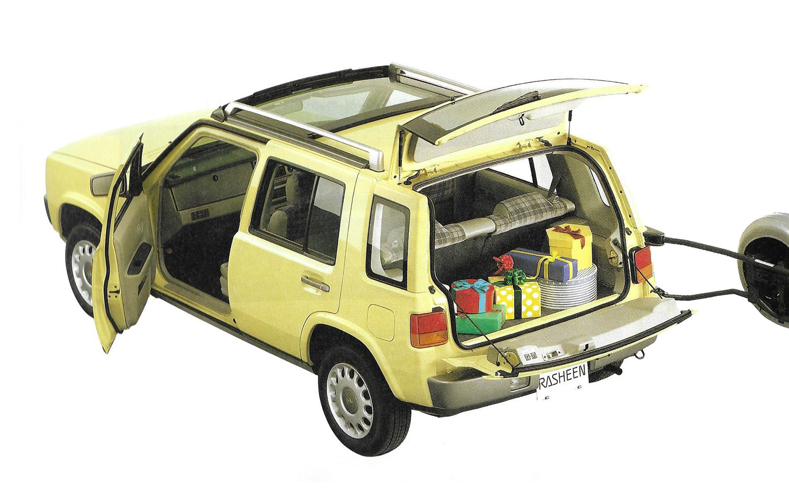 L’époque des PIKE Cars est révolue, mais Nissan n’en a pas fini de sortir des modèles décalés. Le Rasheen est un crossover avant l’heure fabriqué chez Takata Kogyo. C’est encore Naoki Sakai et son studio Water Design, l’auteur des Pike Cars, qui est à l’origine de ce design particulier.