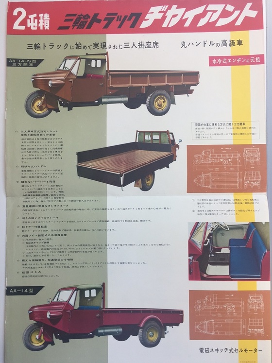 En 1954 sort le modèle AA-11, il est exposé au premier salon de l'automobile du Japon. La chanteuse Columbia Rose se prête à la propagande. A cette époque d'autres moteurs sont proposés : un monocylindre 636 cm3 de 19 ch et un bicylindre 855 cm3 de 28 ch. Parmi tous les tricycles destinés au transport de marchandises, le Giant est très populaire au Japon.