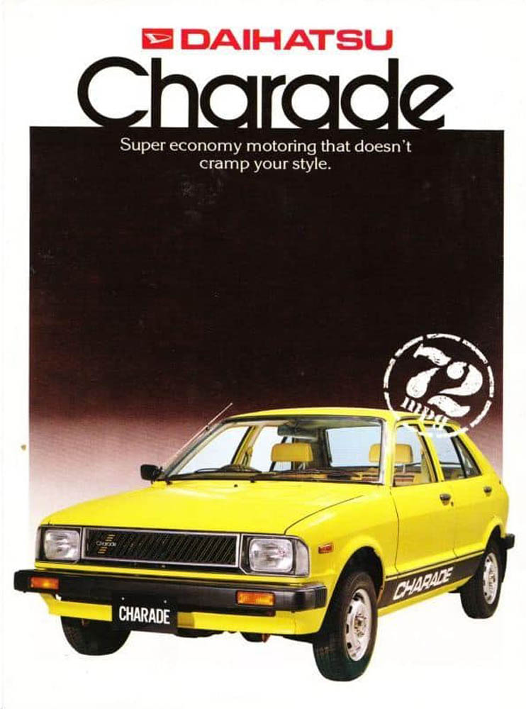 La Charade est une automobile compacte produite de 1977 à 2000. Au départ, son cahier des charges spécifie que l’auto doit pouvoir accueillir quatre personnes adultes dans 5 m2. Afin de respecter une dimension si petite, un nouveau moteur est développé. C’est un 3 cylindres de 993 cm3 qui développe 55 ch (CB-10). Il est placé à l’avant et entraîne les roues avant. Deux boîtes manuelles sont disponibles, à 4 et à 5 rapports, mais aussi une automatique à 2 rapports.