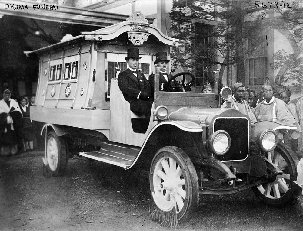 Deux photos du corbillard qui a servi aux obsèques de Shigenobu Okuma, ancien Premier Ministre du Japon, décédé en 1922,