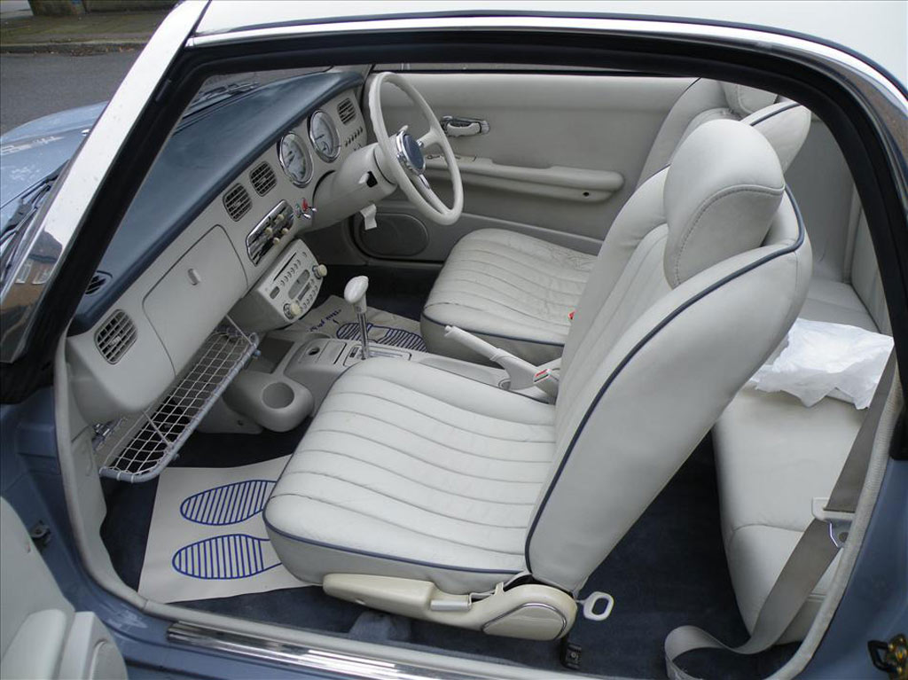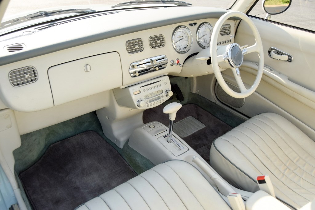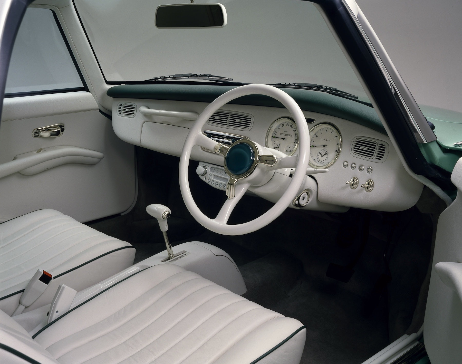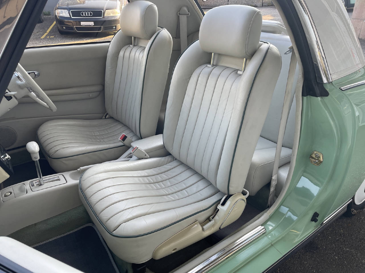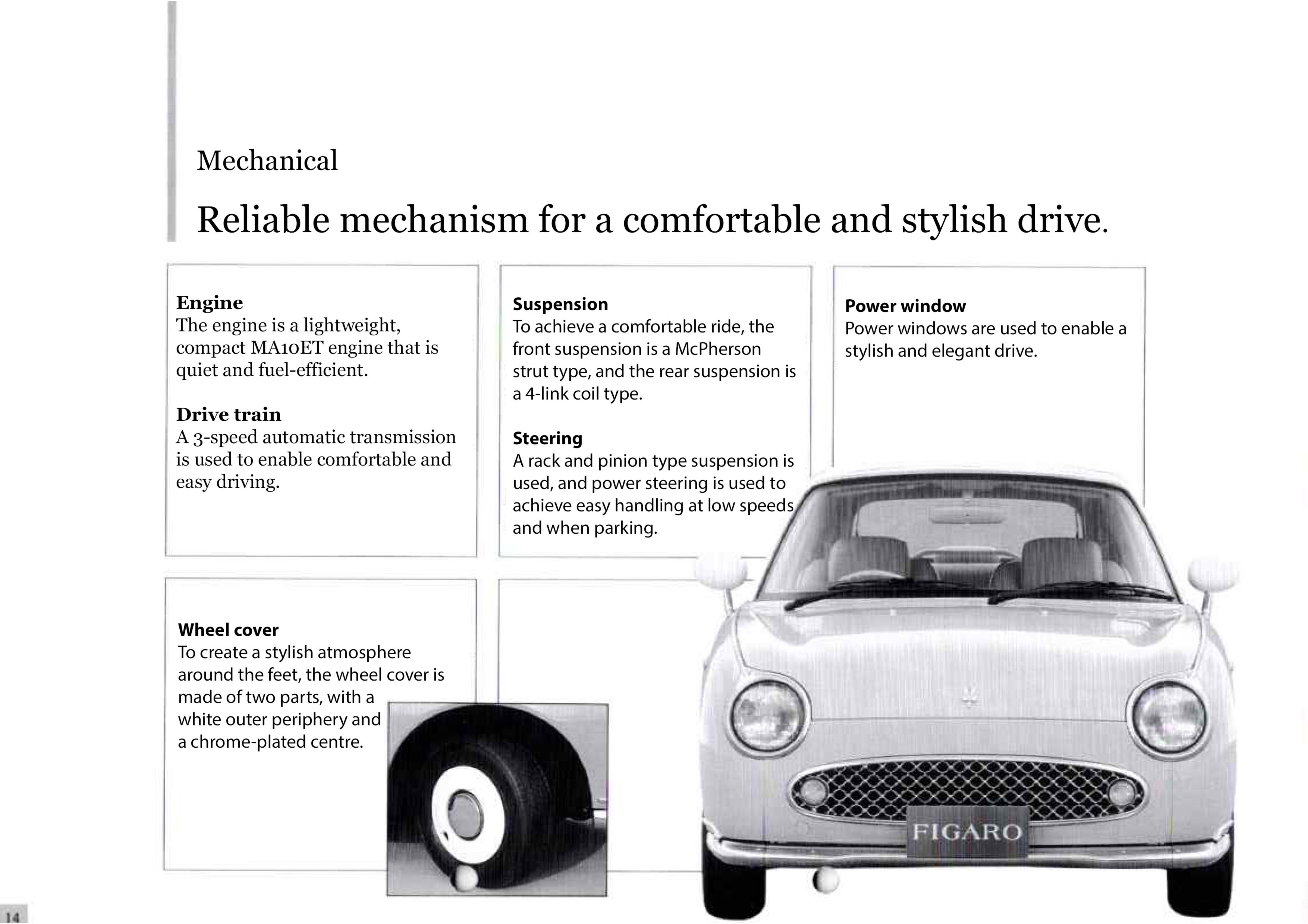 Cette adorable petite machine de 374 cm de long reprend la base et le moteur de la Micra. Le bouclier et les ailes avant sont en fibre de verre. Du au fait que le toit en toile couvre toute la partie supérieure de l’auto, le châssis a dû être renforcé et la voiture est plus lourde qu’une Micra standard, 810 kg contre 770 kg. Afin de palier au manque de puissance, un turbocompresseur est monté sur le moteur 4 cylindres en ligne OHC de 1 L (MA10ET) qui gagne en puissance, 76 ch et 106 Nm. La transmission est confiée à une boîte automatique à 3 vitesses. La vitesse maximum est de 170 km/h, en théorie, avec vent dans le dos. La Figaro n’a rien d’une voiture de sport, au niveau du châssis, des suspensions, des freins et de la mécanique, ce sont les organes de la Micra. Elle reste donc un citadine mais avec une émanation particulièrement douce et ludique que l’on ne trouve pas dans une autre automobile.