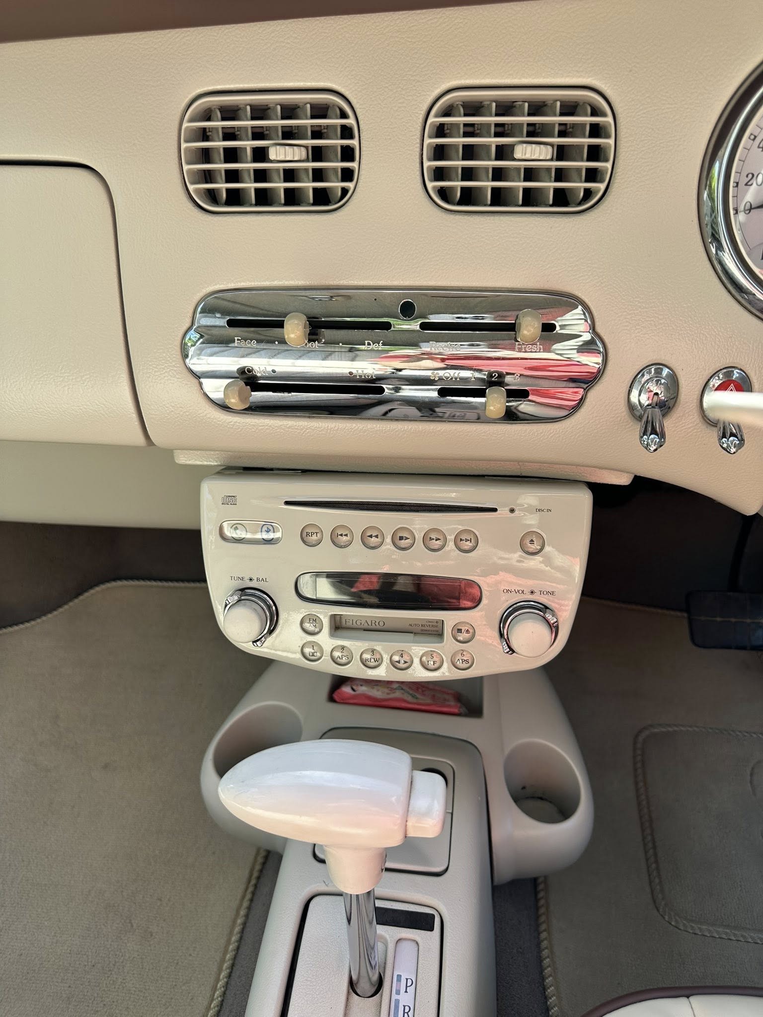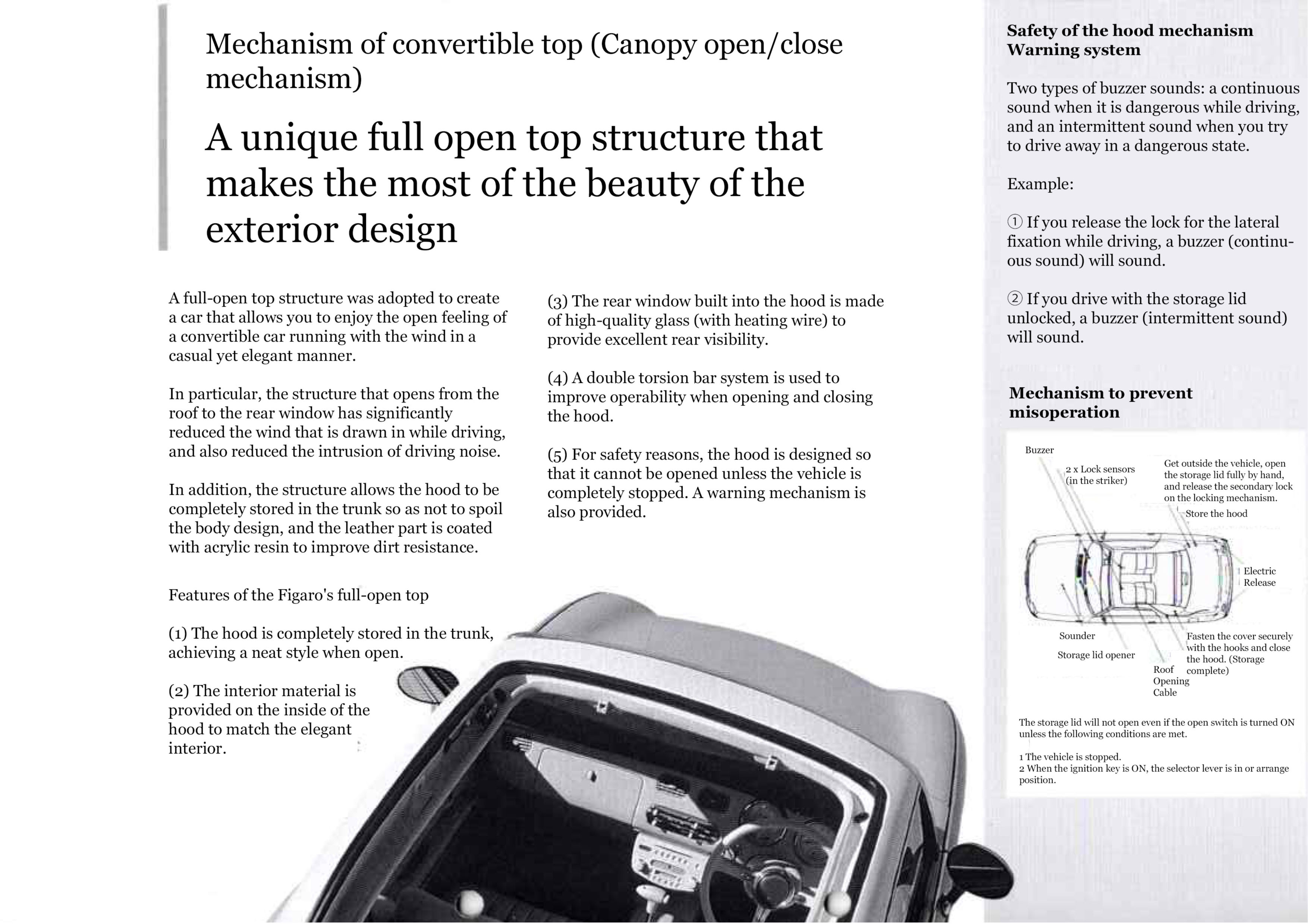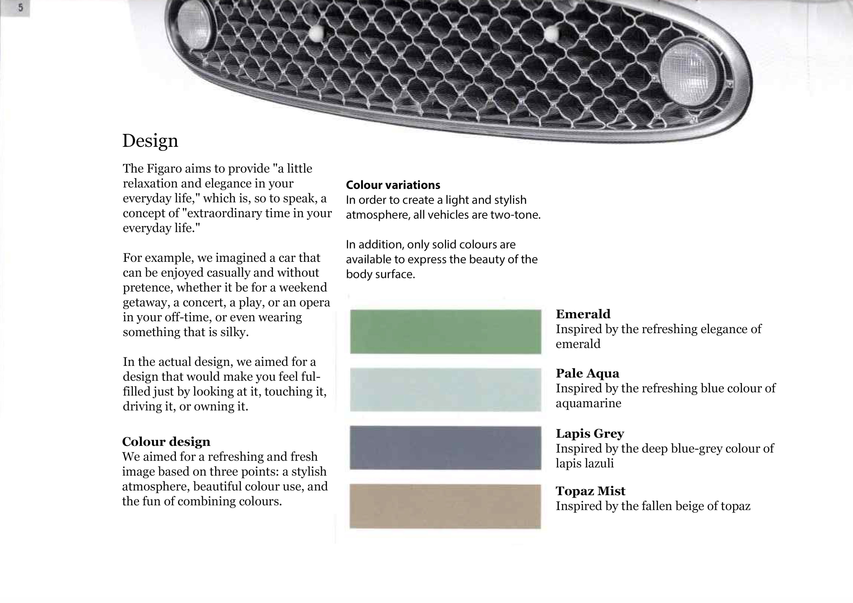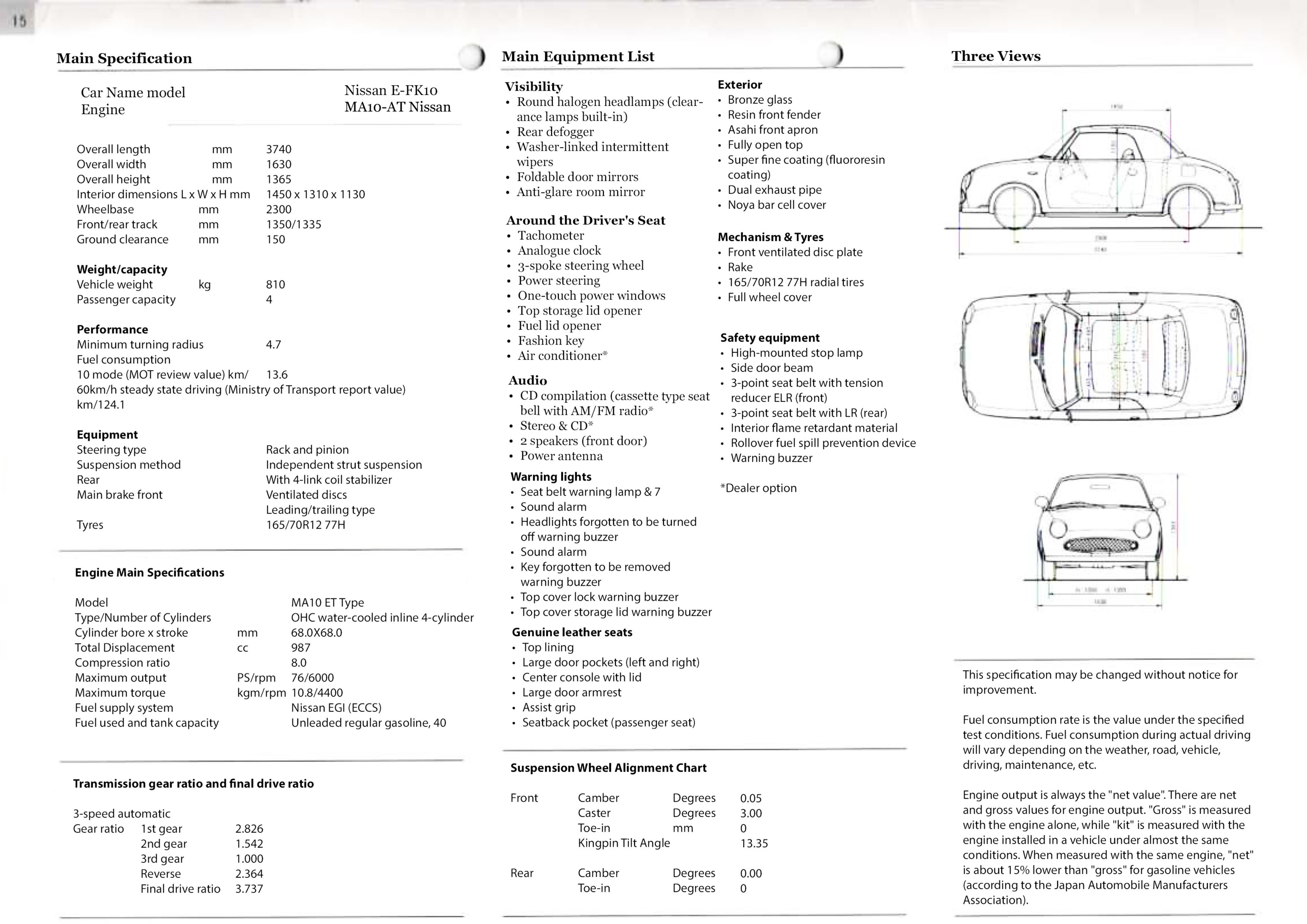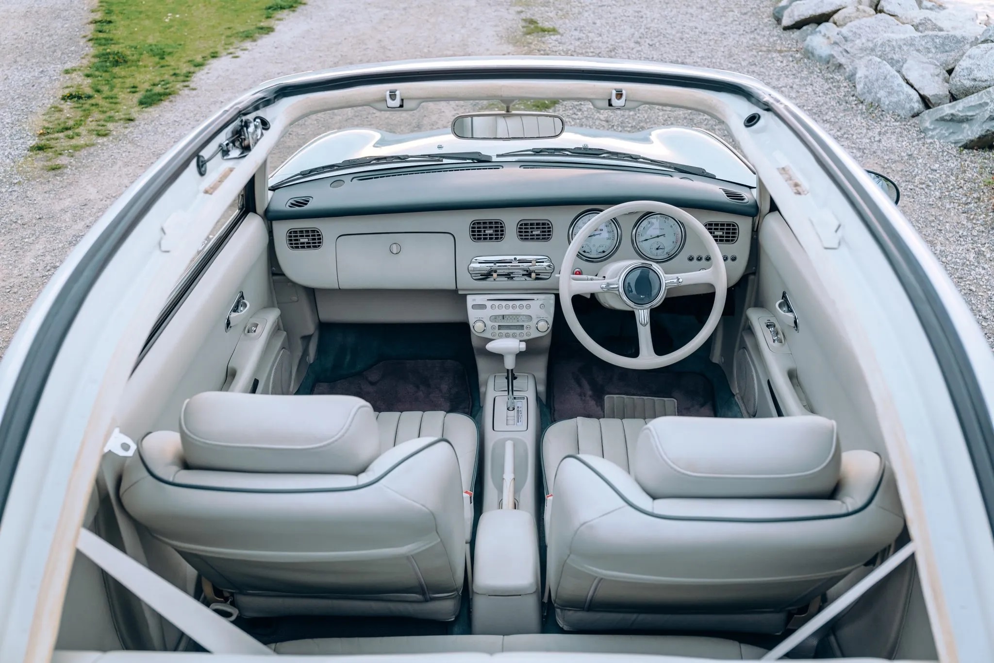 Cette adorable petite machine de 374 cm de long reprend la base et le moteur de la Micra. Le bouclier et les ailes avant sont en fibre de verre. Du au fait que le toit en toile couvre toute la partie supérieure de l’auto, le châssis a dû être renforcé et la voiture est plus lourde qu’une Micra standard, 810 kg contre 770 kg. Afin de palier au manque de puissance, un turbocompresseur est monté sur le moteur 4 cylindres en ligne OHC de 1 L (MA10ET) qui gagne en puissance, 76 ch et 106 Nm. La transmission est confiée à une boîte automatique à 3 vitesses. La vitesse maximum est de 170 km/h, en théorie, avec vent dans le dos. La Figaro n’a rien d’une voiture de sport, au niveau du châssis, des suspensions, des freins et de la mécanique, ce sont les organes de la Micra. Elle reste donc un citadine mais avec une émanation particulièrement douce et ludique que l’on ne trouve pas dans une autre automobile.
