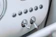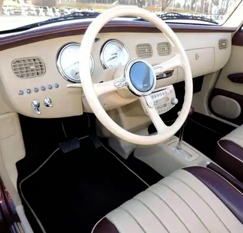 A l’intérieur, on est bien loin des ambiances sombres et insipides des voitures modernes. Dans la Figaro, c’est le soleil de Toscane, tout fleure bon avec les souvenirs vintages et la dolce vita. Le tableau de bord lisse et simple comprend deux magnifiques compteurs circulaires, des grilles d’aération coupe-frites, les commandes de la climatisation entourées d’une plaque chromée, quatre interrupteurs basculants également chromés et ce volant fin qui semble fait de bakélite blanche avec le bouton du klaxon au centre de la même teinte que la carrosserie. Même l’autoradio avec lecteur de cassette et CD a un look surgissant du passé. Le levier de vitesse de la boîte semble avoir été réalisé par Hurst pour l’USS Enterprise de Star Treck. Ce n'est pas une vraie 4 places, l'espace réservé à la banquette arrière est très limité.