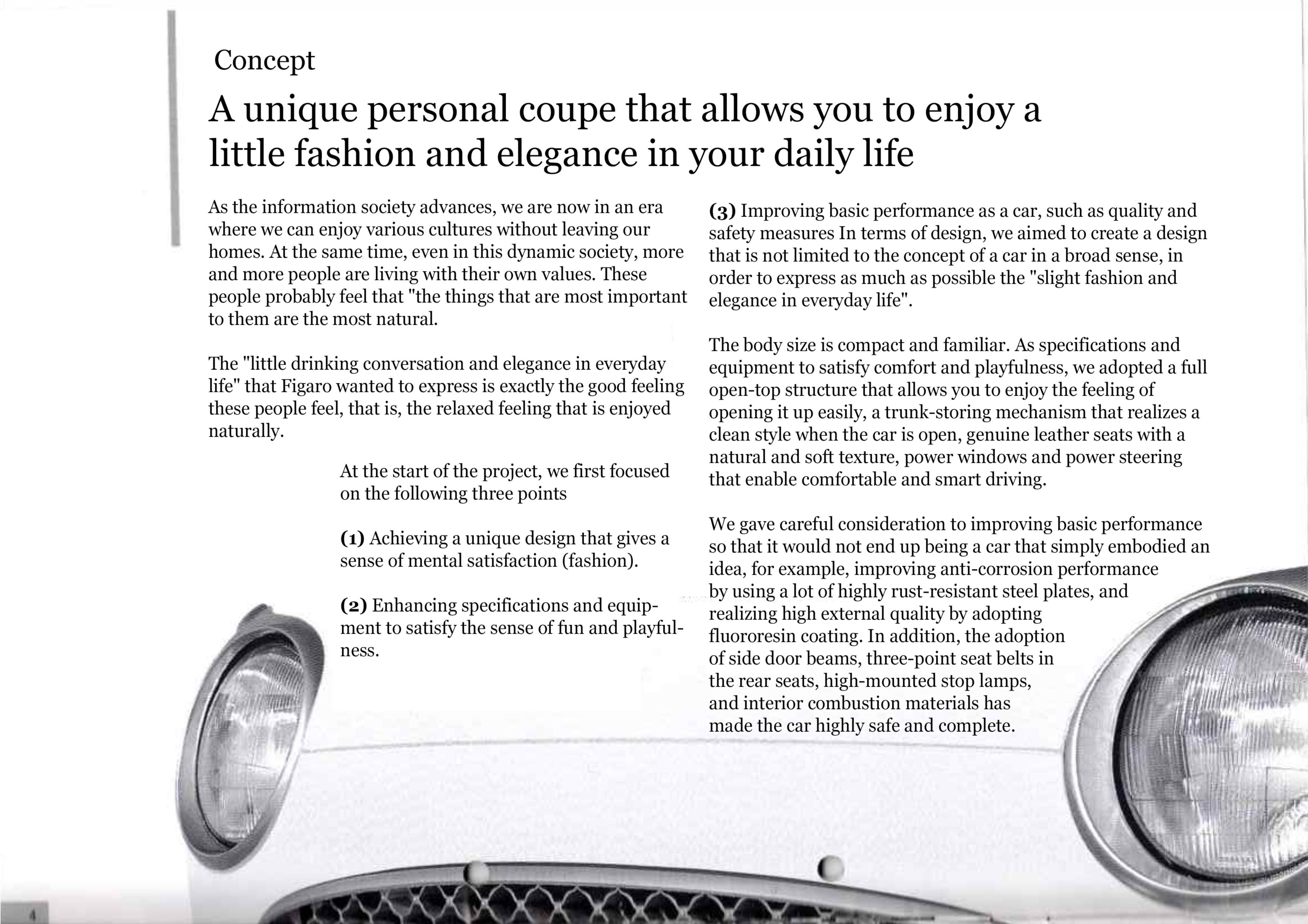 PIKE Factory a débuté avec La Be‑1, puis la Pao. La troisième réalisation de l'atelier est la Figaro. Elle est présentée en 1989 au salon de l’automobile de Tokyo dont le thème, cette année, est « Retour vers le Future ».