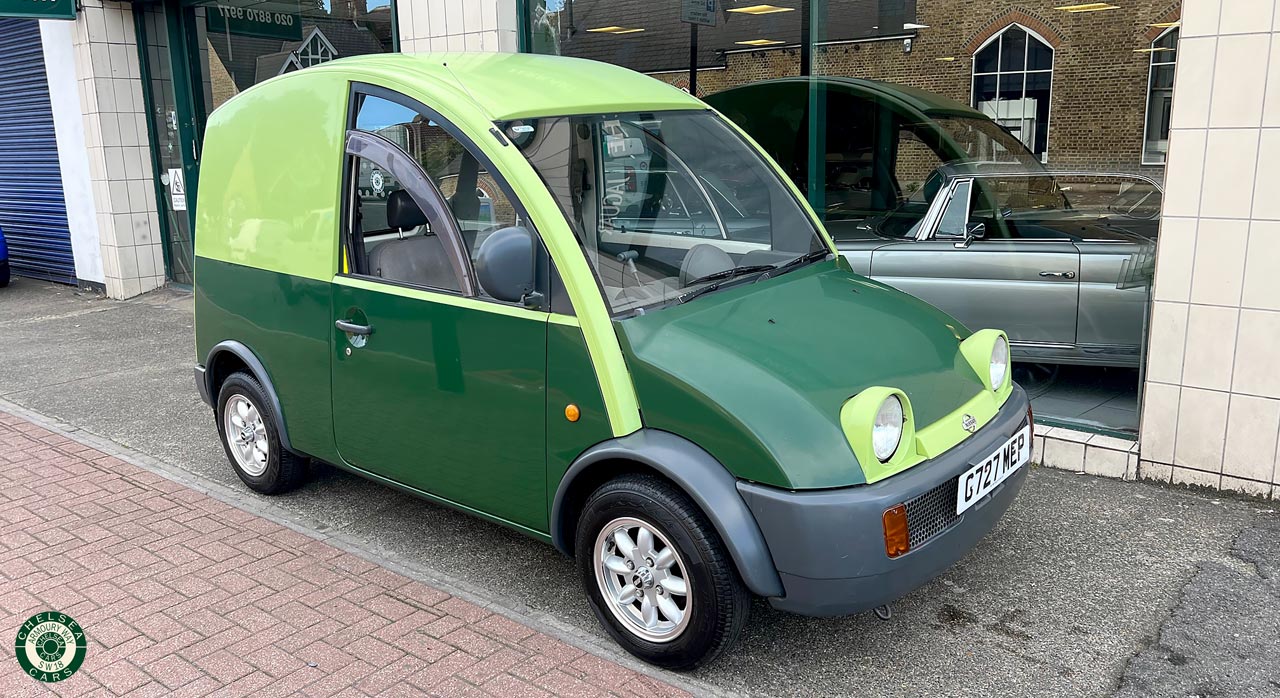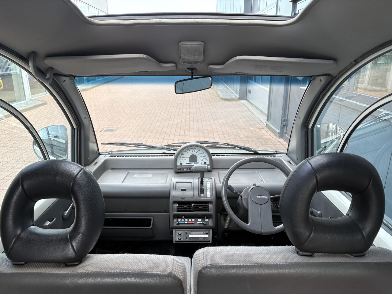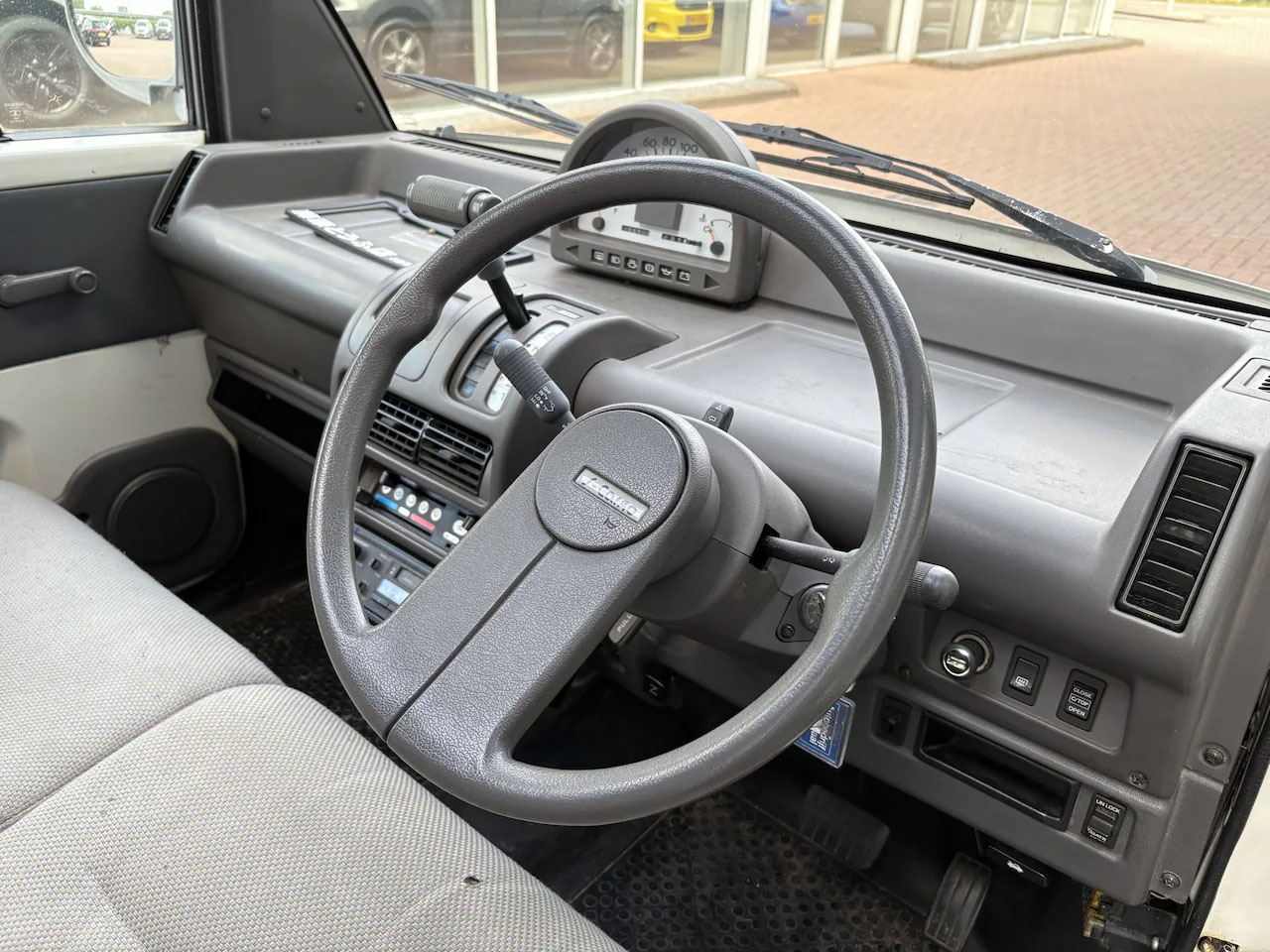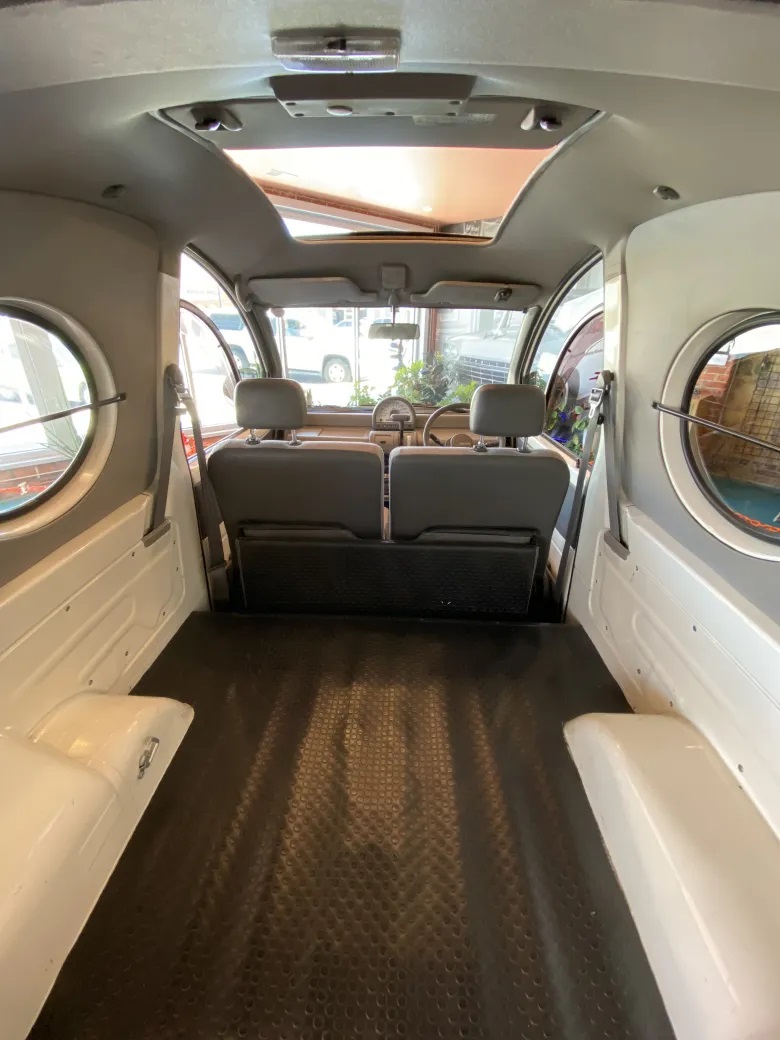 Il y a deux banquettes pour les passagers. Les vitres ne sont pas électriques mais il y a l'air conditionné, ce qui est plutôt rare dans un utilitaire de cette époque. Le poids à vide est de 970 kg et la a capacité de charge s'élève à 200 kg mais en rabattant la banquette arrière, il est possible de charger 300 kg.