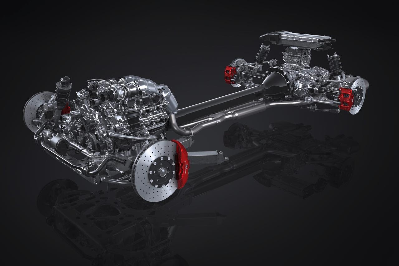 Afin de parfaire la répartition du poids qui est de 45:55, l'ensemble boîte-pont-embrayage est placé à l'arrière. L'arbre de transmission en fabriqué en CFRP. Le traditionnel convertisseur de couple est remplacé par un embrayage à bain d’huile. La boîte de vitesse comporte 8 rapports et le différentiel est à glissement limité mécanique. La partie électrique consiste en un moteur greffé au transaxle.