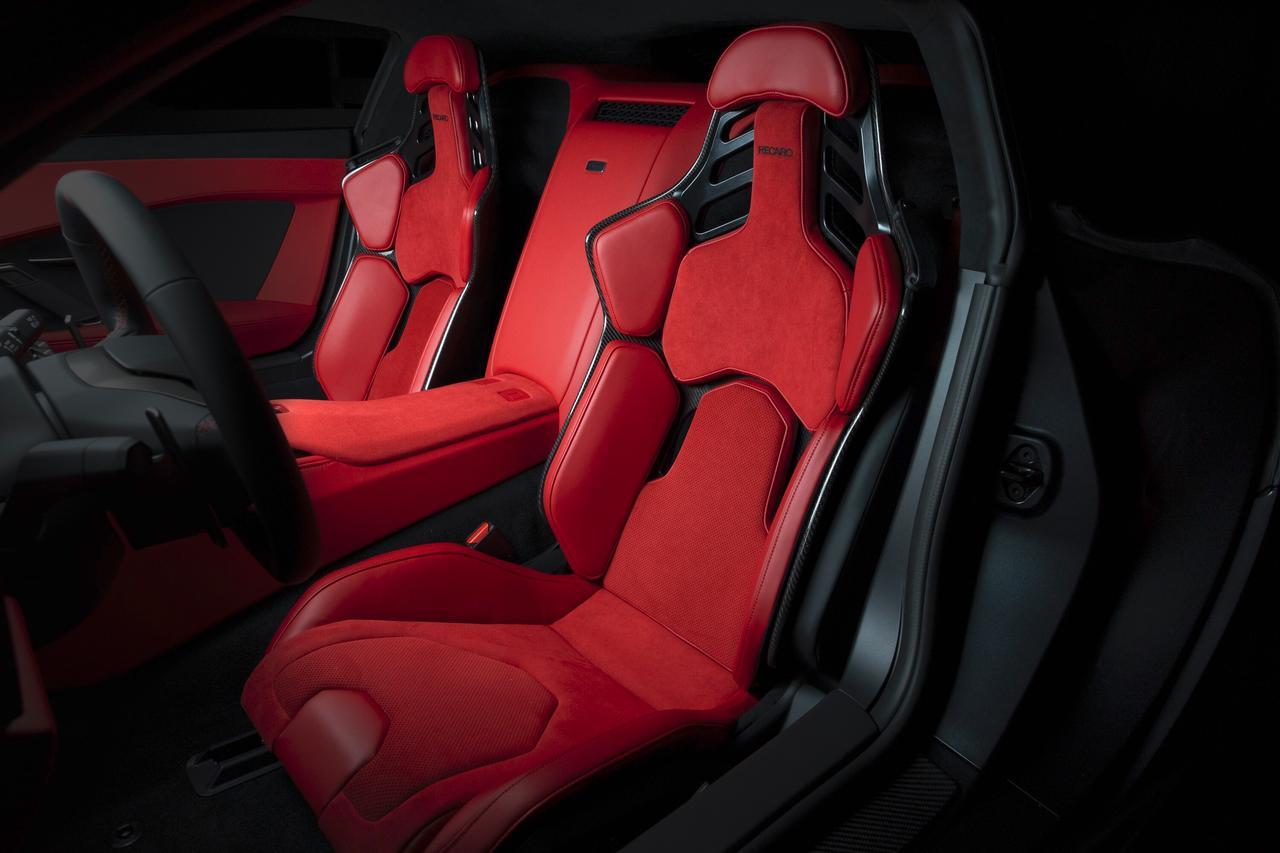 L'intérieur est traité sur un style sportif, entendez par là masculin. Cuir et Alcantara rouge sur fond noir mat et brillant. Les instruments sont regroupés sur un écran digital placé derrière le volant. Une tablette placée au centre du tableau de bord, et pas vraiment intégrée, permet de commander tactilement certaines fonctions. Le volant contient des boutons de commande sur les branches, deux palettes en arrière et deux molettes satellites. C'est joli et fonctionnel, mais il n'y a rien de particulièrement nouveau.