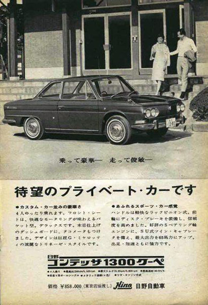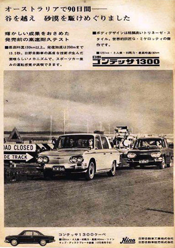 DEL Racing engage des Contessa 1300 dans les compétitions japonaises. Malgré leur compétitivité, elles ne remportent aucune course. Brock Racing Enterprise (BRE) fait courrir des Hino sur les circuits américains. Deux Contessa 1300 prennent les premières places dans une course en 1966.