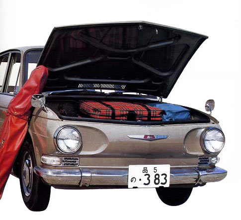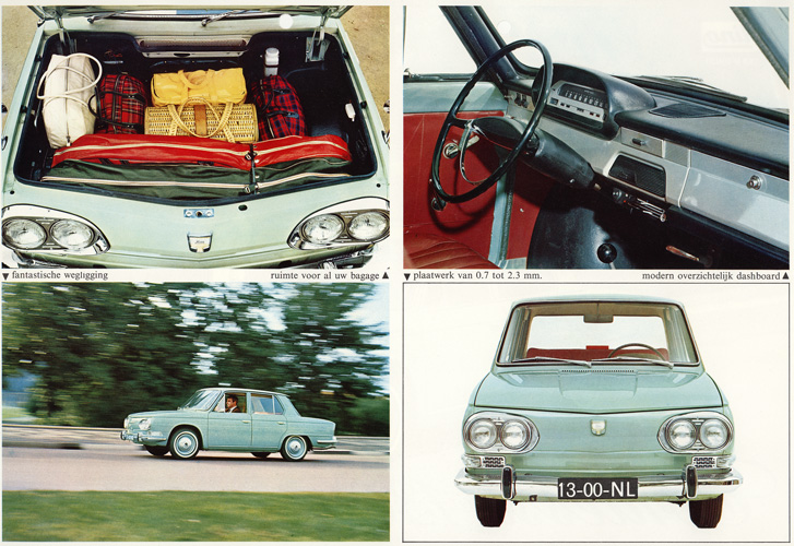En regardant cette face avant dépourvue de calandre, je ne peux m'empêcher de penser à la Chevrolet Corvaire également à moteur arrière et dessinée en 1959. La Berline est livrée en version Standard ou Deluxe. La Standard, plus économique, dispose de moins d'équipement et est reconnaissable aux optiques simples à l'avant, alors que la Deluxe dispose d'optiques doubles.