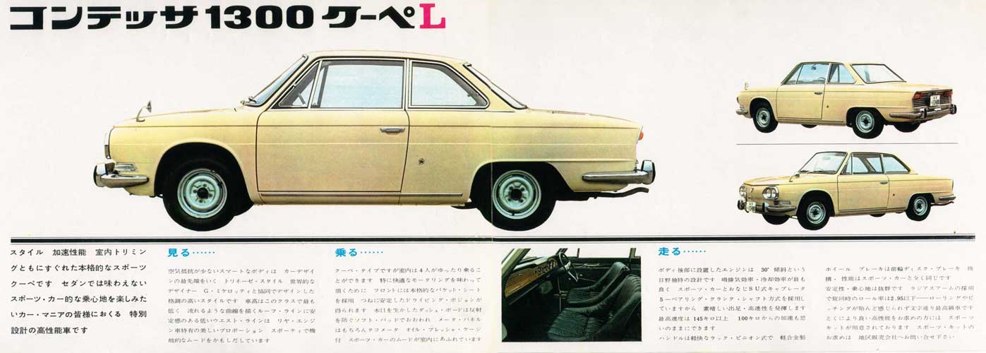 Au salon de Tokyo 1966, sont présentés deux prototypes. Une Contessa 1300S dont le moteur est alimenté par deux carburateurs Mikuni-Solex. Avec une admission et un échappement améliorés, ainsi qu'un taux de compression augmenté, la puissance est proche de 80 ch.. La seconde auto est une Contassa 1300 Coupe S, avec une culasse DOHC et deux carburateurs double-corps Solex. la puissance est supérieure à 90 ch. Une version de série est en projet, la Contessa 1300 Coupé GT ne verra jamais le jour.