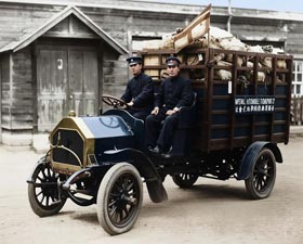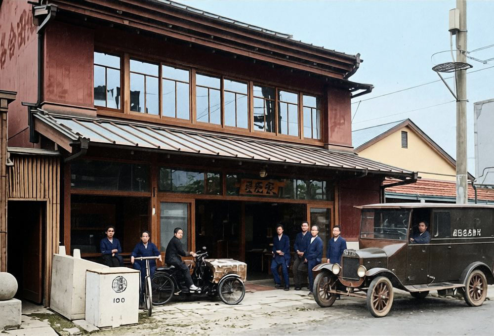 En décembre 1908, la Poste de Tokyo se sert de trois camions pour la distribution du courrier de Noël en lieu et place de deux charrettes tirées par des chevaux.
