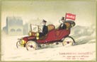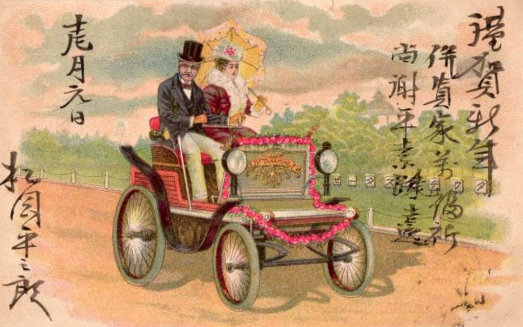 Carte de voeux du Dr. Jokichi Takamine pour Nouvel An 1910. L'illustration est reprise et modifiée d'une carte postale française de 1899. La voiture est une De Dion Bouton " Vis à vis " de cette époque |