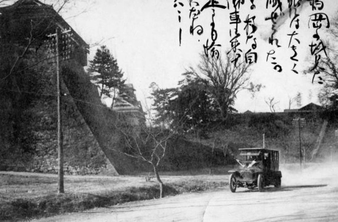Essai d'une voiture électrique au château de Miyagi, 1900 |