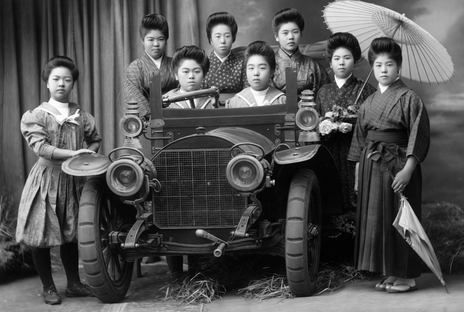 Jeunes geishas posant avec une photographie d'une automobile, 1915 |