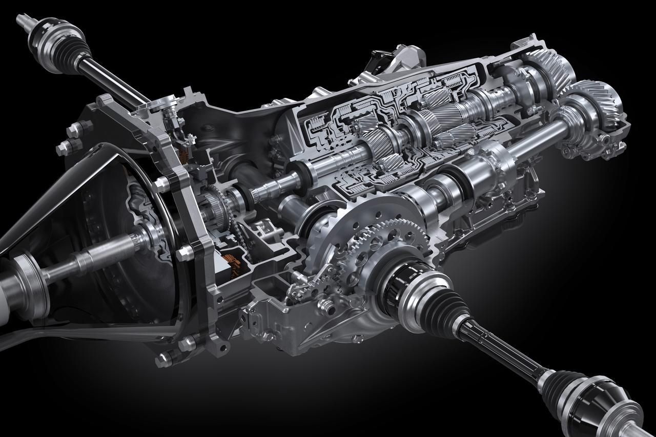Afin de parfaire la répartition du poids qui est de 45:55, l'ensemble boîte-pont-embrayage est placé à l'arrière. L'arbre de transmission en fabriqué en CFRP. Le traditionnel convertisseur de couple est remplacé par un embrayage à bain d’huile. La boîte de vitesse comporte 8 rapports et le différentiel est à glissement limité mécanique. La partie électrique consiste en un moteur greffé au transaxle.