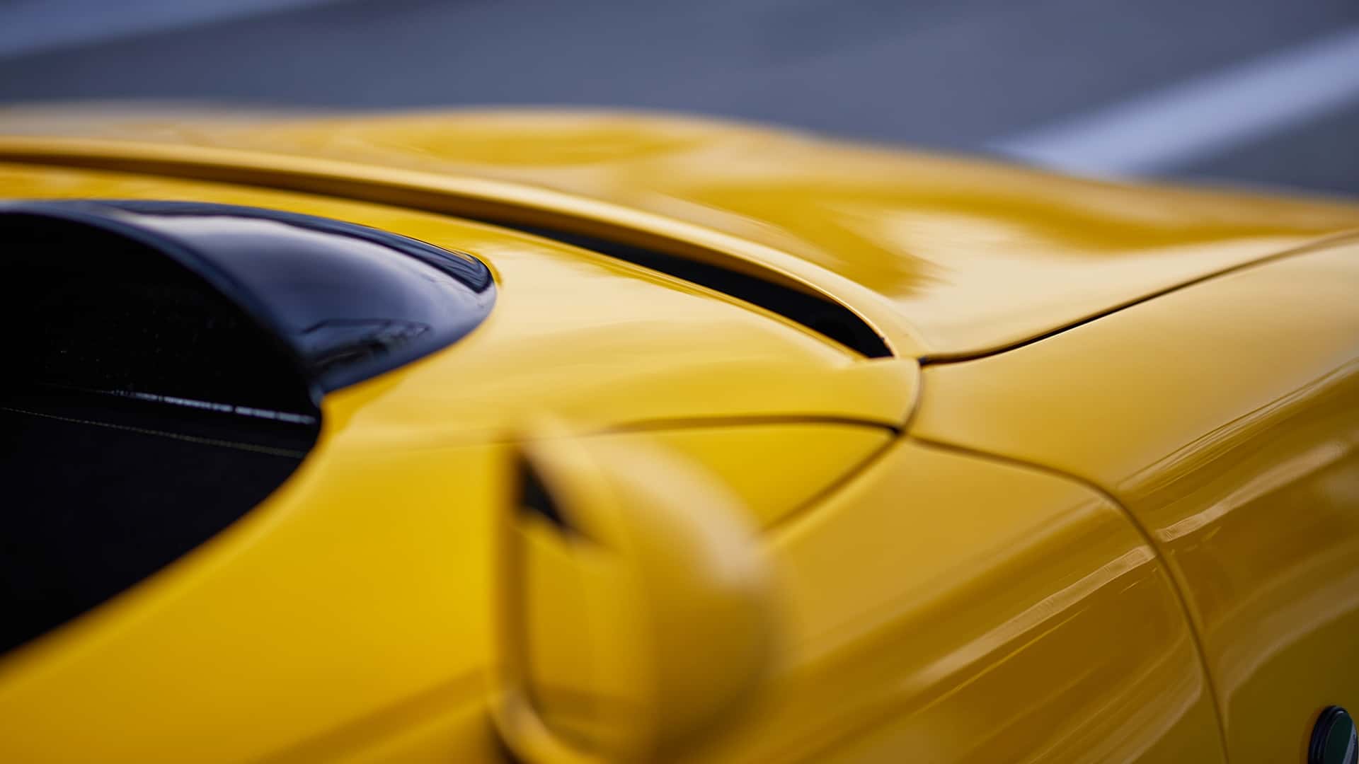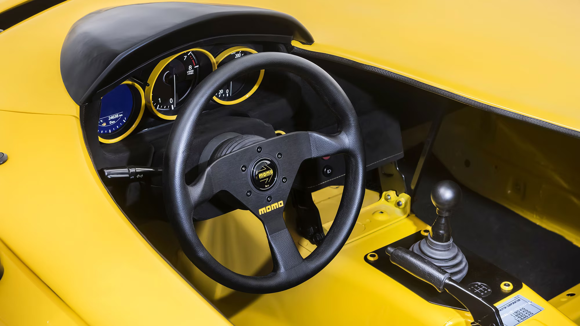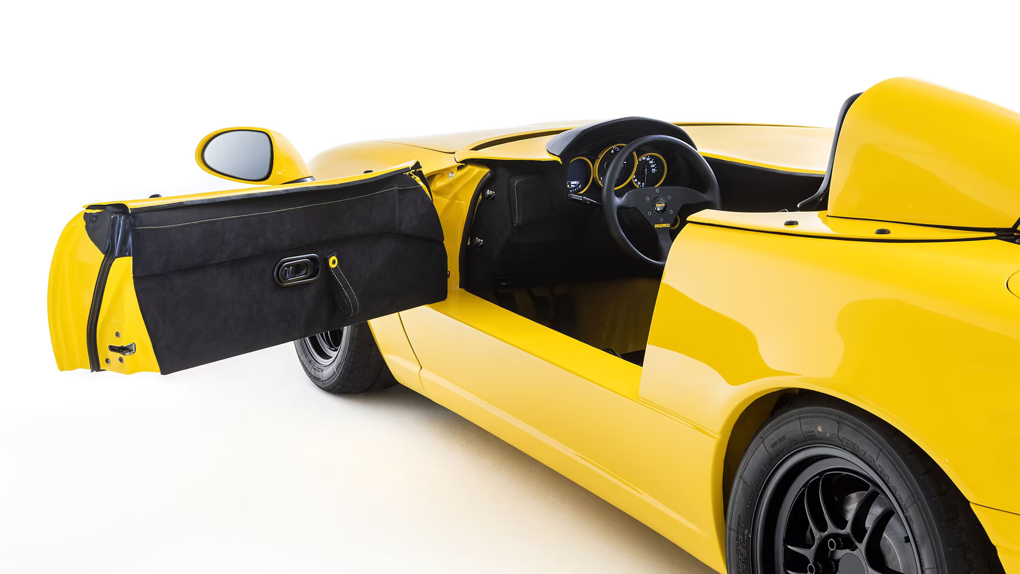 A la base d'où se trouvait le parebrise une fente courant sur toute la largeur du capot sert d'évacuation d'air chaud au compartiment moteur. Le couvre-tonneau rigide qui recouvre presque entièrement l’habitacle a une progression sinueuse et intègre un carénage aérodynamique qui protège l’instrumentation. Capots, ailes et portes sont réalisés en fibre de carbone. Les sièges sont fabriquée d'une pièce et la sellerie est en d'Alcantara. Les instruments bien visibles sont regroupés derrière un volant MOMO traditionnel.