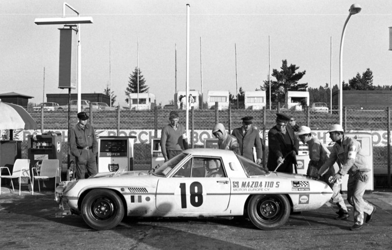 Le "Marathon de la Route" est devenu "84 Heures du Nürburgring" en 1965. Mazda y participe en 1967 avec une Mazda 1000 (Familia) qui n’arrive pas au bout de l’épreuve. Le constructeur japonais revient en 1968 avec deux Cosmo L10A préparées à 130 ch. La #18 est conduite par un équipage japonais composé de Yoshimi Katayama, Nobuo Koga et Masami Katakura. La #19 est confiée à un trio de pilotes belges, Jean-Pierre Ackermans, Yves Deprez, et Leon Dernier. Les voitures fonctionnent bien, après 80 tours elles occupent les 4e et 5e places derrière deux 911 et une Fulvia. Malheureusement #18 perd une roue et fini dans le décor. Katayama, qui est alors à son volant s’en sort indemne. #19 effectue 344 tours et termine à 2 tours de la Porsche victorieuse, en quatrième position. C’est un exploit extraordinaire qui aide considérablement à changer l’opinion qu’ont les gens du moteur Wankel. A noter qu'elles ont la calandre de la prochaine L10B, procurant plus d'air au radiateur.