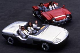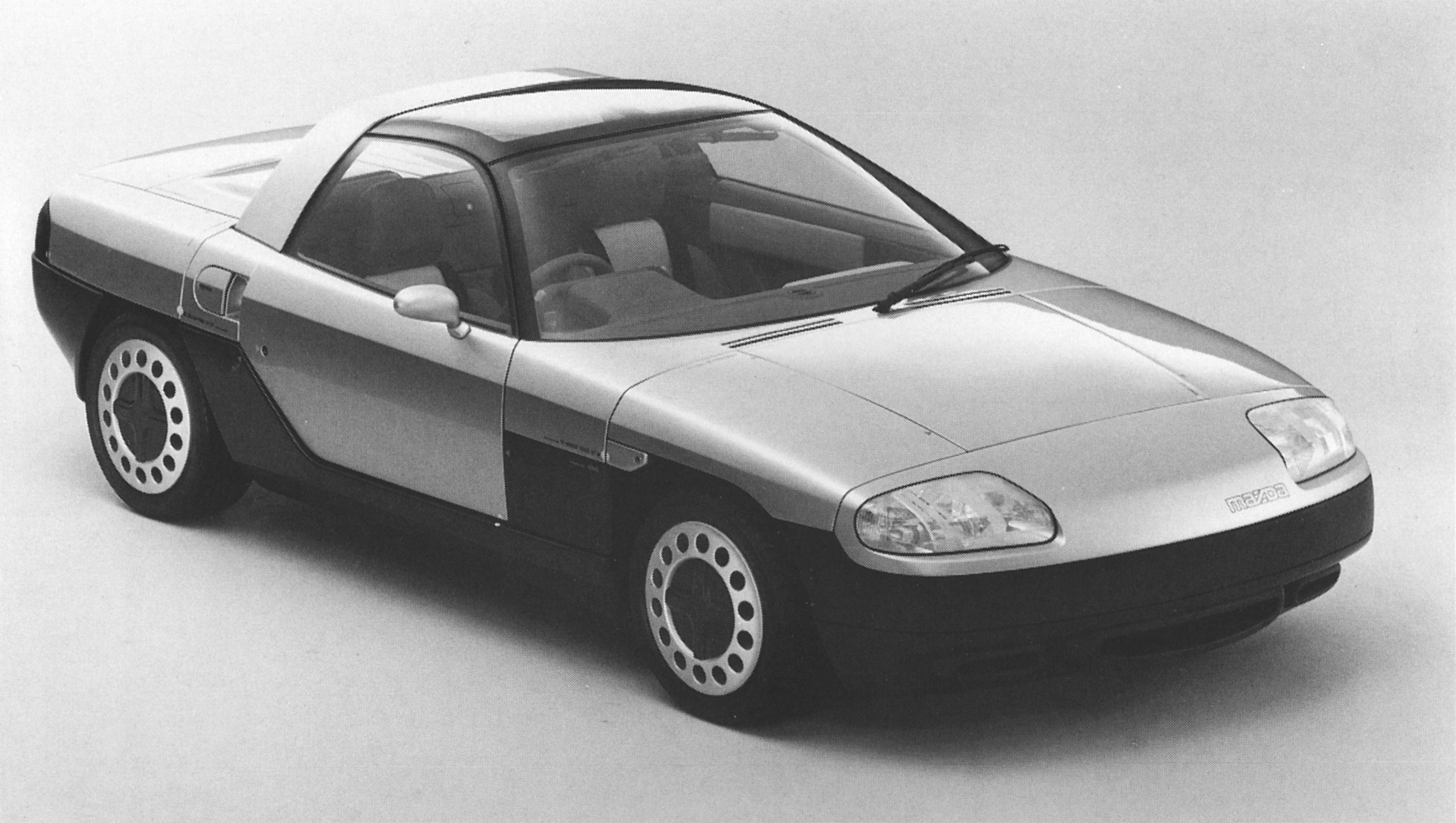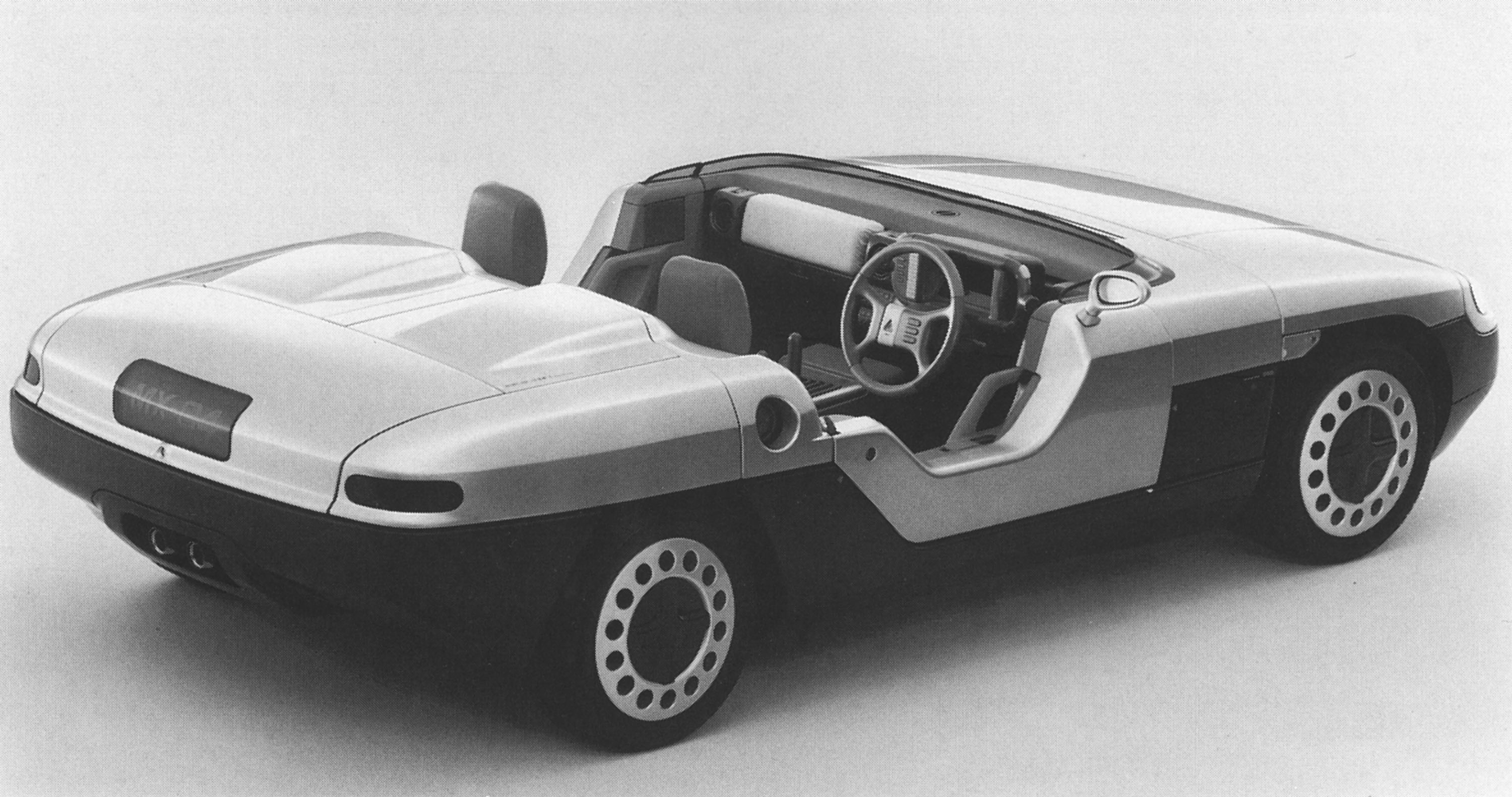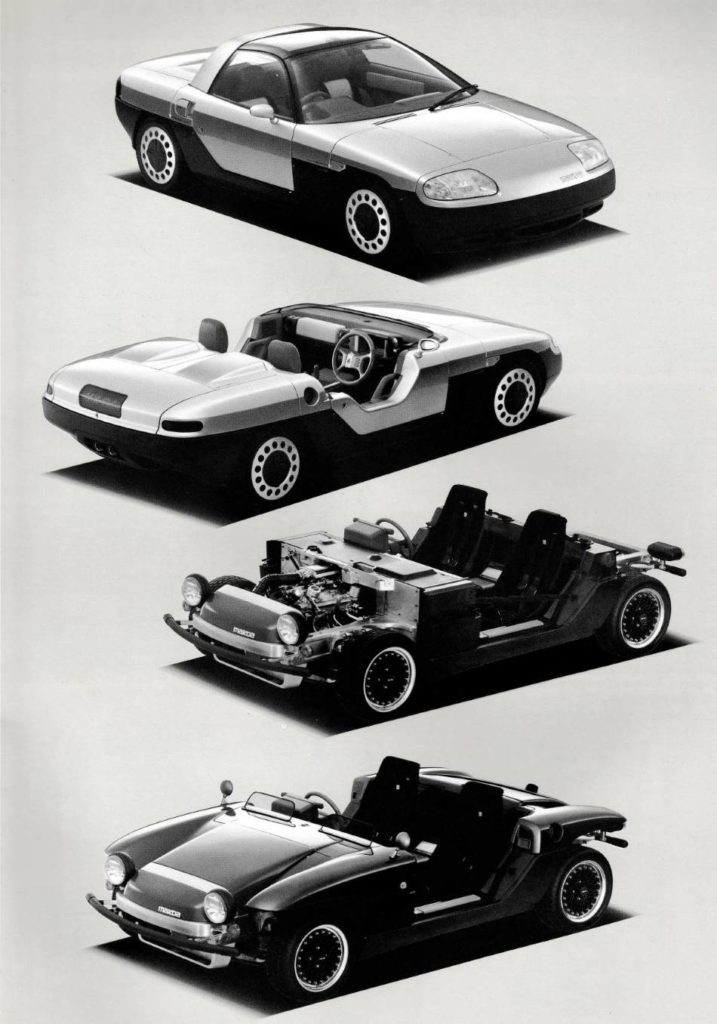 En 1987 Mazda présente le concept MX-04 au salon de Tokyo. L’idée est de proposer une petite sportive à deux places avec une carrosserie modulable. Des panneaux de carrosserie amovibles en fibre de verre permettent de passer d’un coupé à un spider ou à une sorte de buggy.