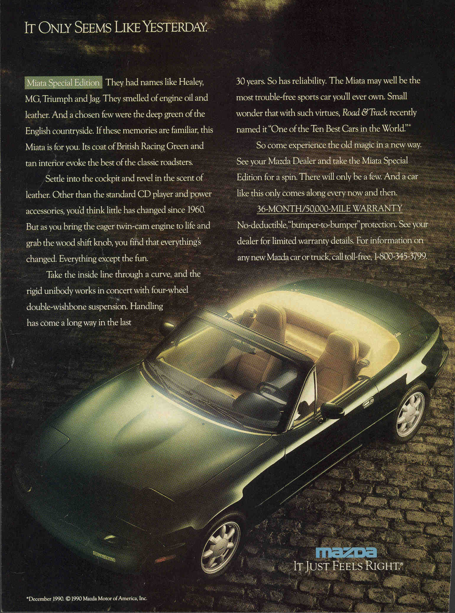 La V-Special est la première série spéciale de la MX-5 pour célébrer le premier anniversaire du cabriolet. Son style vintage luxueux rend hommage aux roadsters anglais dont elle s'inspire. Elle est présentée au salon de Tokyo en octobre 1989 déjà, mais n'est commercialisée qu'en juillet 1990.