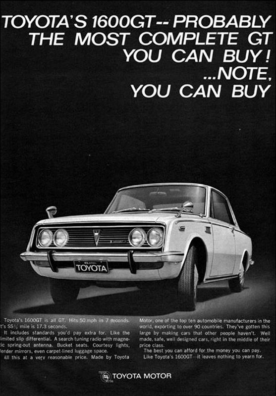 La Toyota 1600GT dérive directement du coupé Corona RT50. Ce n'est pas un hasard si elle apparaît en 1967, à la même époque que sa concurrente directe, la Nissan Bluebird SSS.